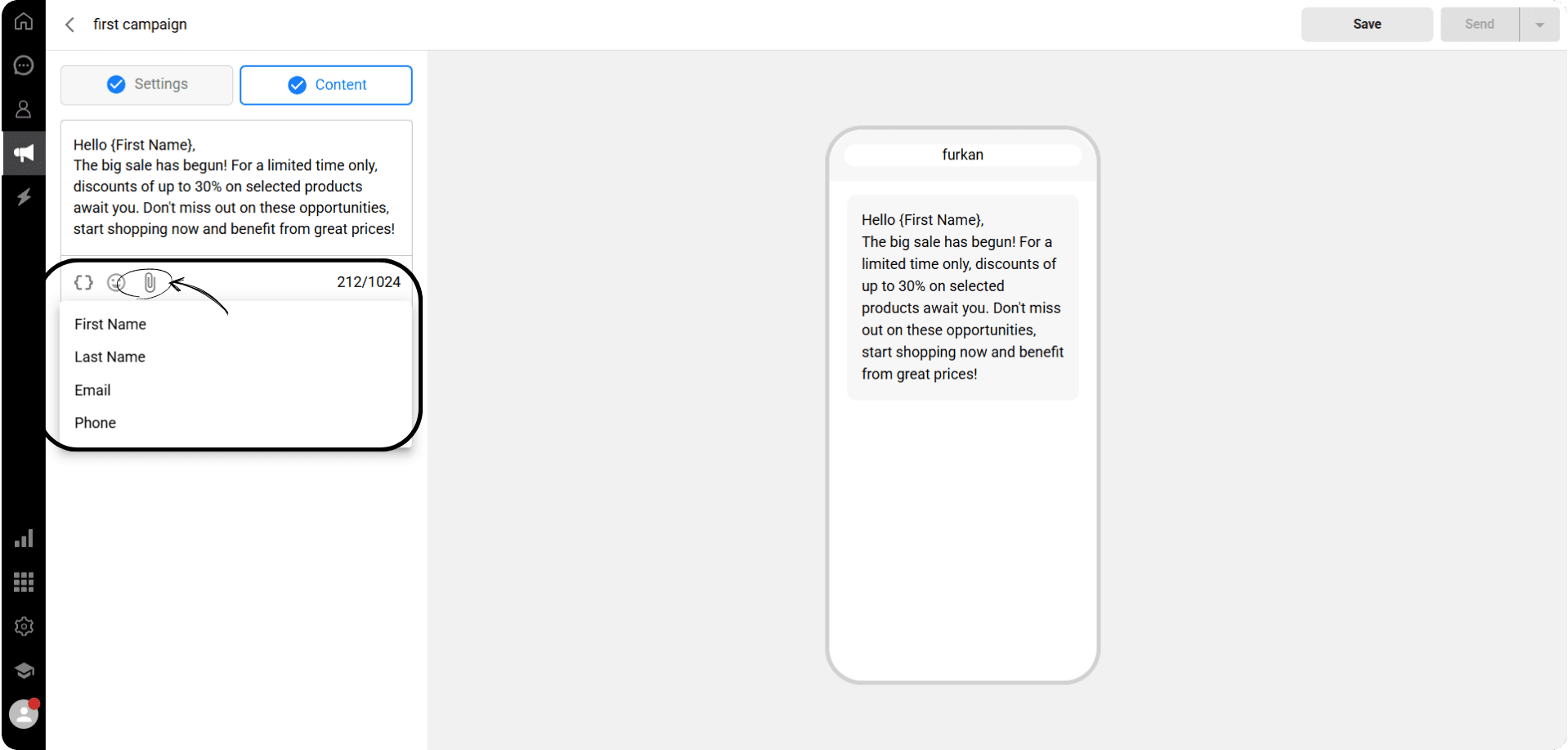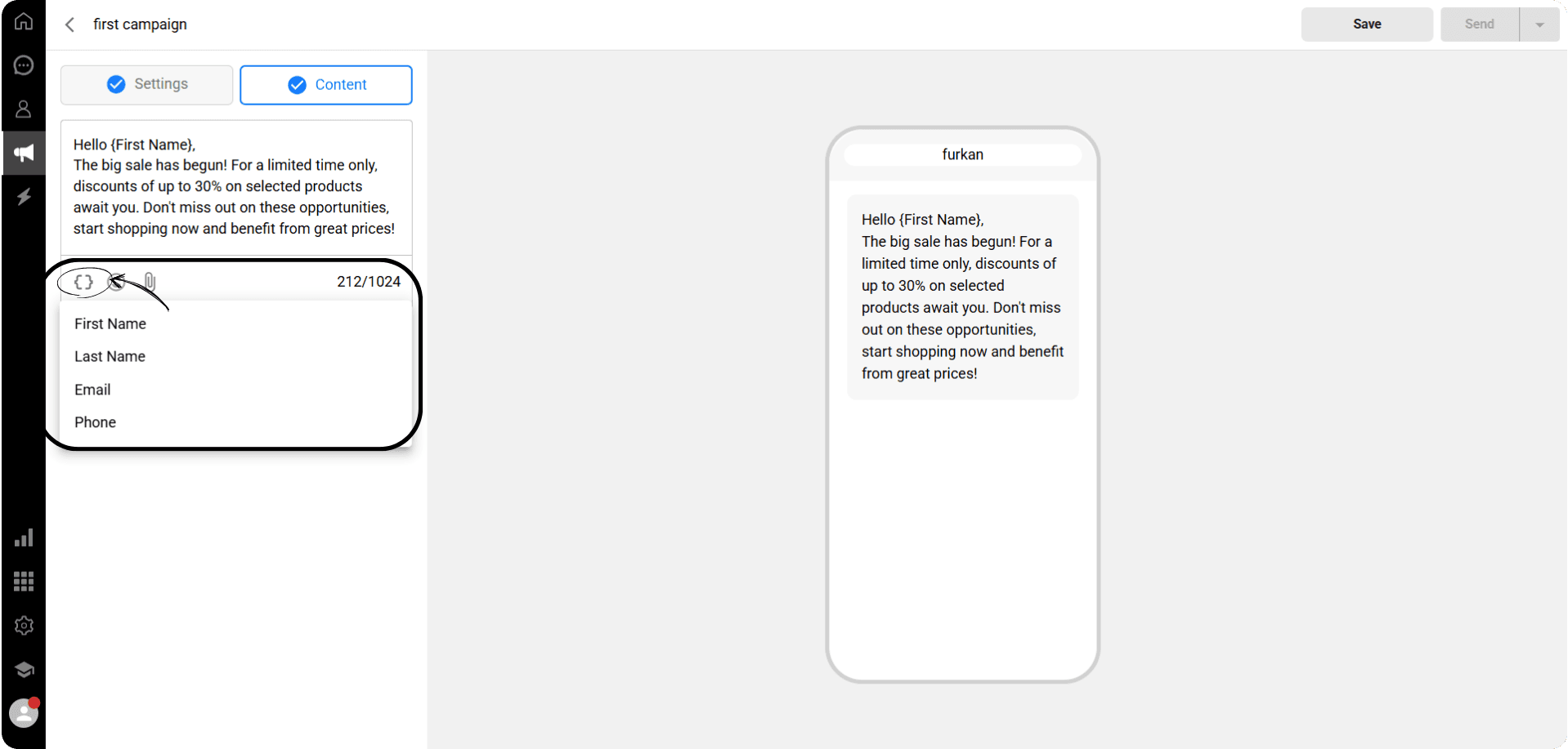 You can add any of the data fields from the marked area to your campaign message. When the message is sent, the selected data field will be automatically filled with the corresponding information for each recipient. For example, if you use {Name}, it will be replaced with the name under which the recipient is saved on the Qpien Contacts page.