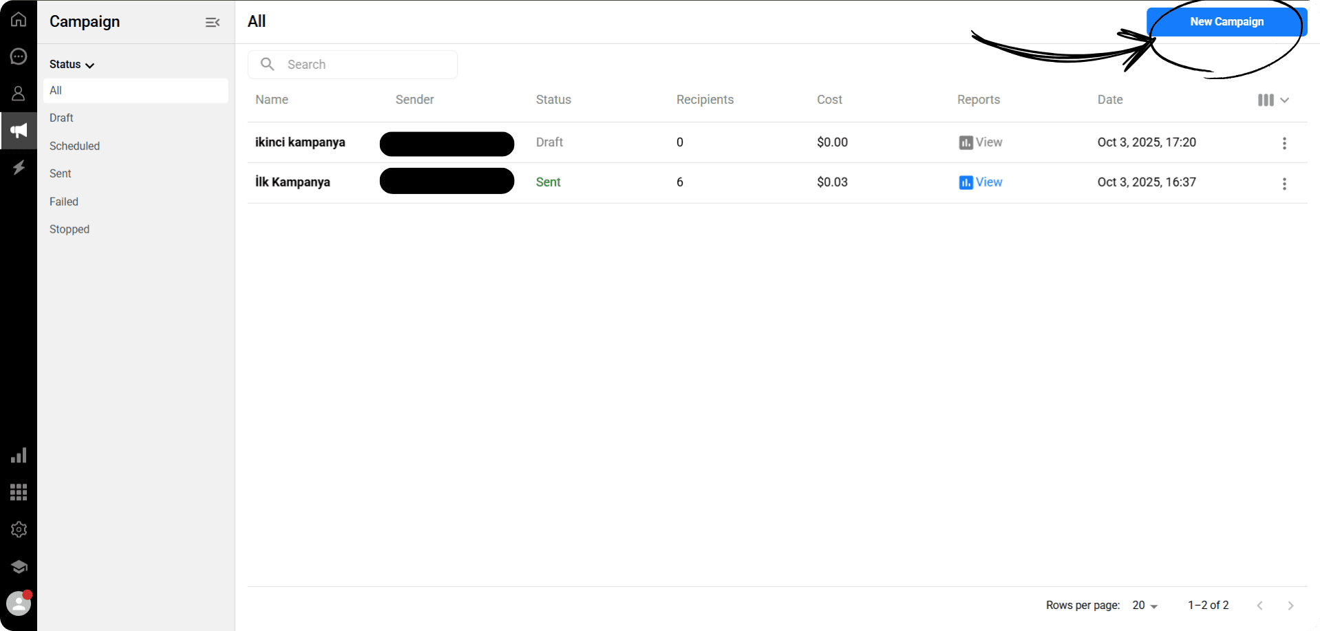 To start a new campaign, click the “New Campaign” button located at the top right of the page.