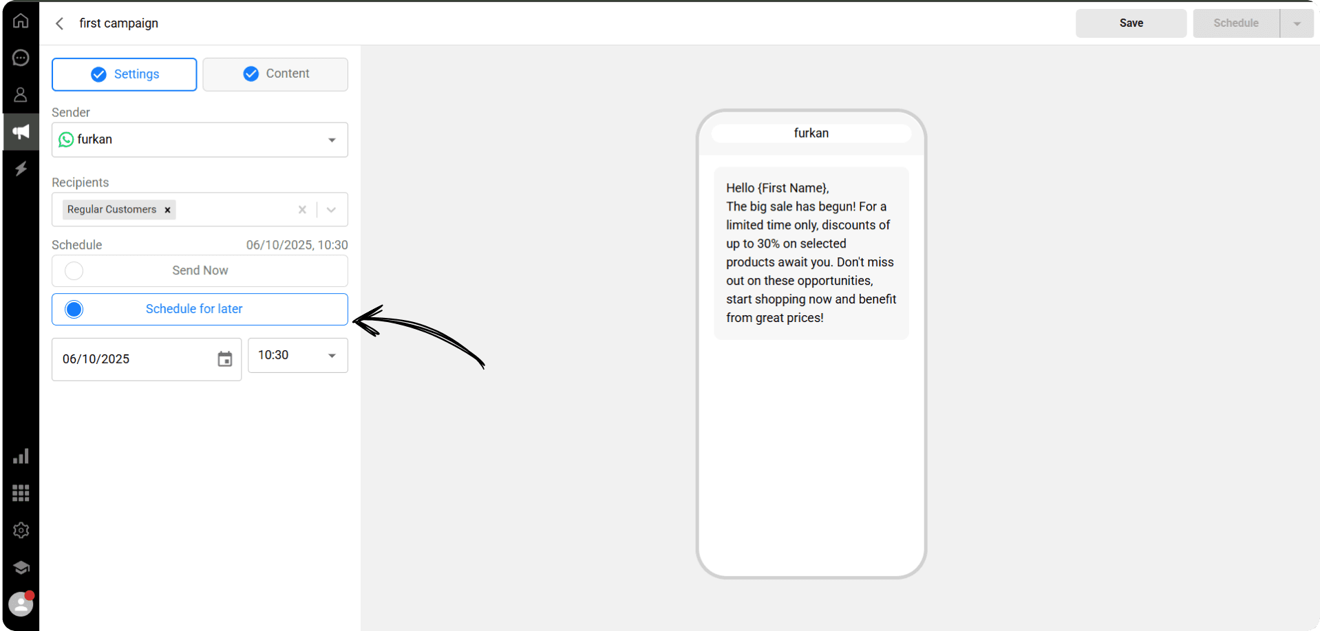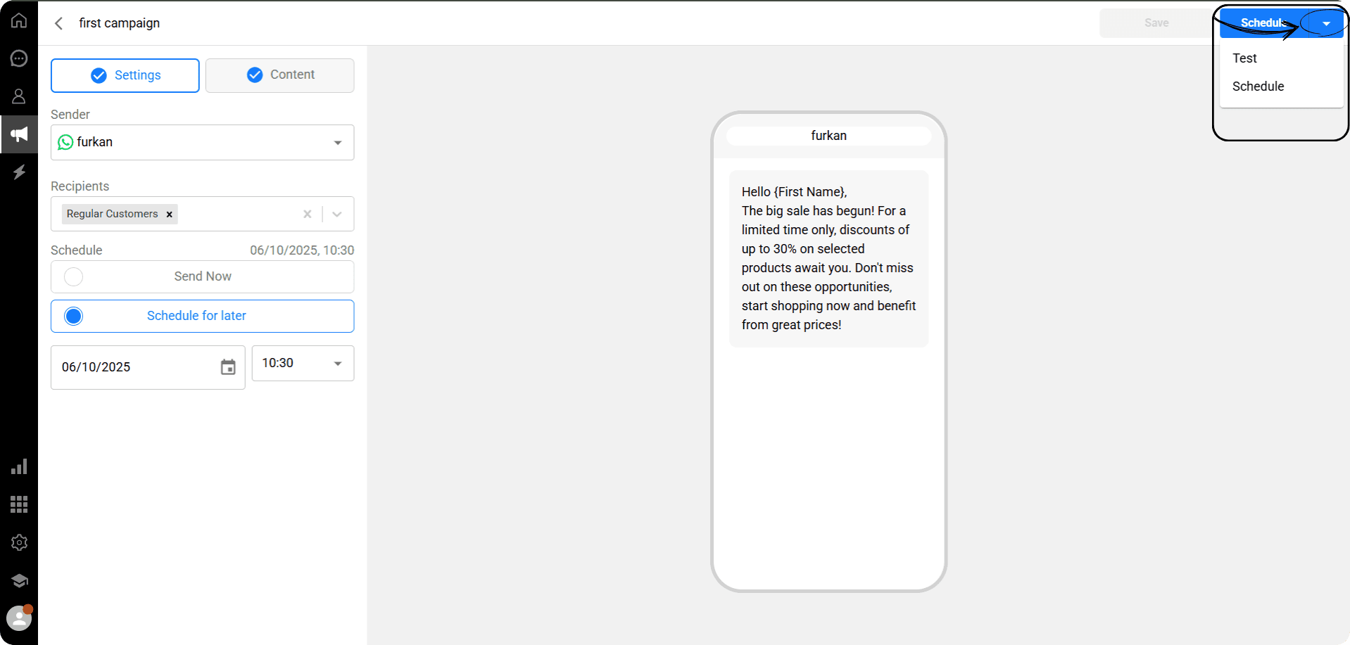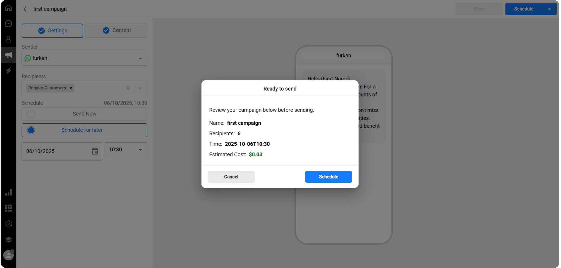 After checking all the information, click the Schedule button to plan your campaign to be sent on the selected date and time.