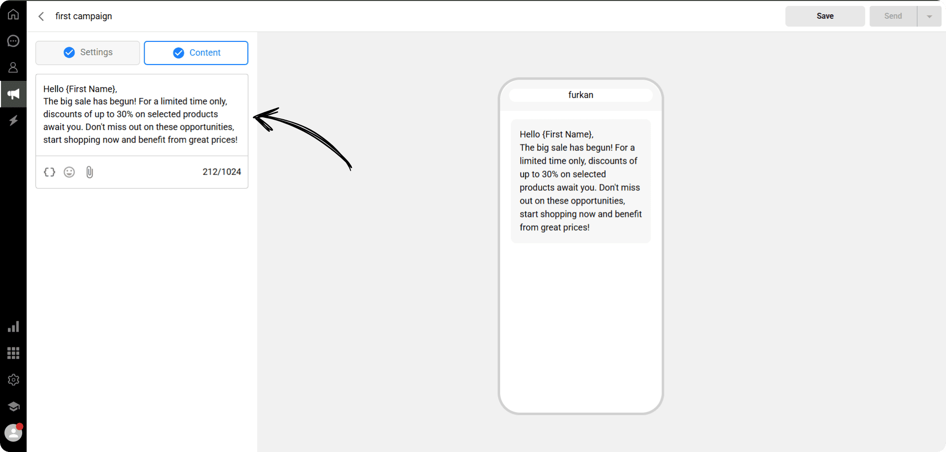 On the Content page, write your campaign message.