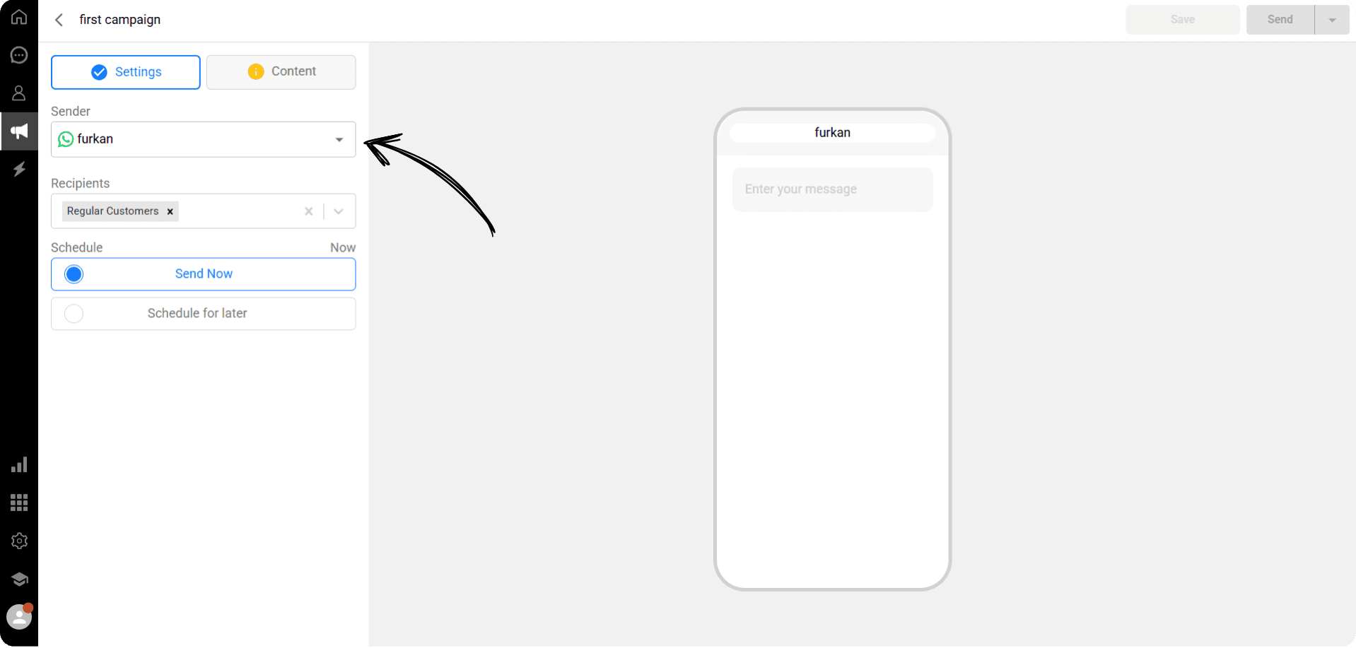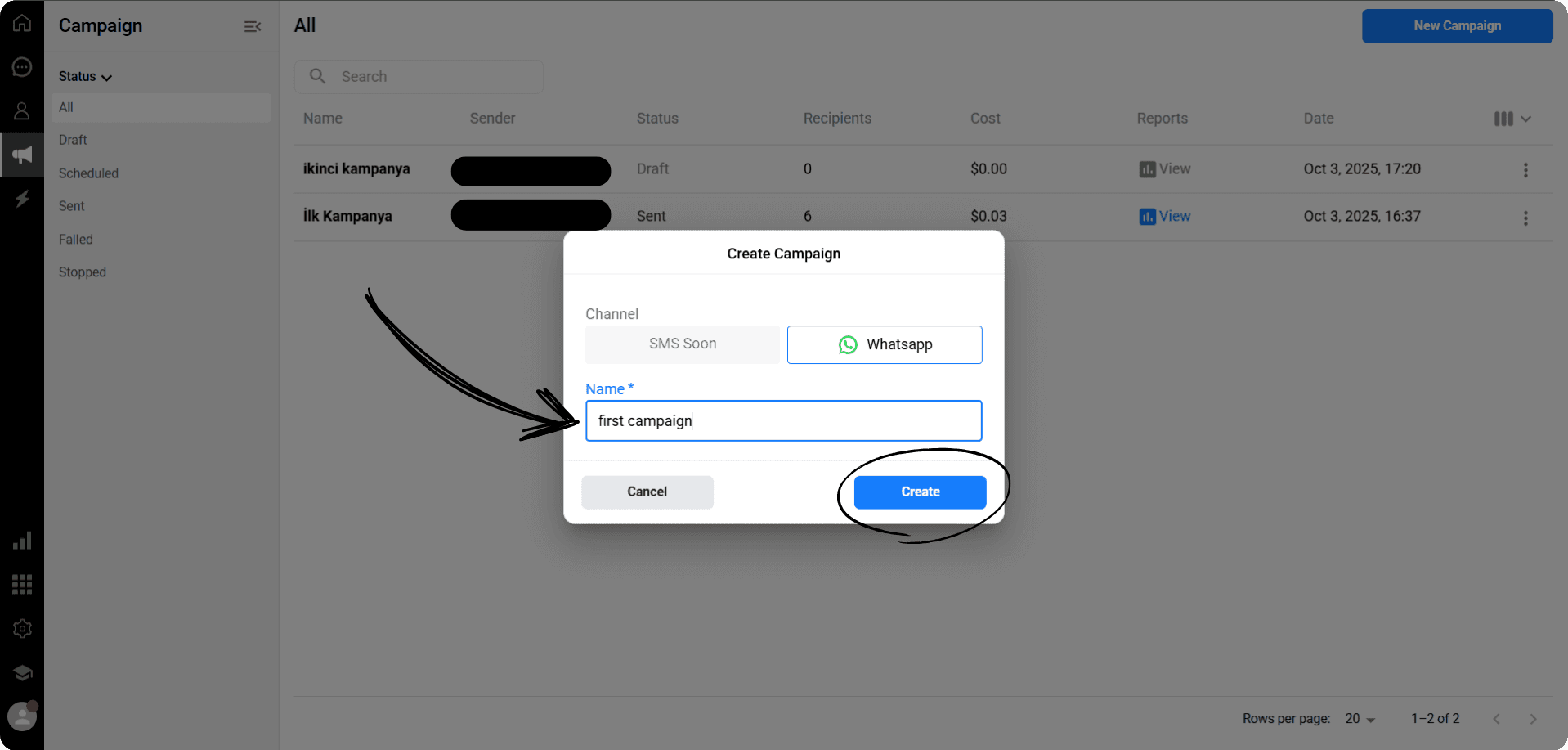 On the campaign creation screen, select the WhatsApp channel you want to use as the Sender.