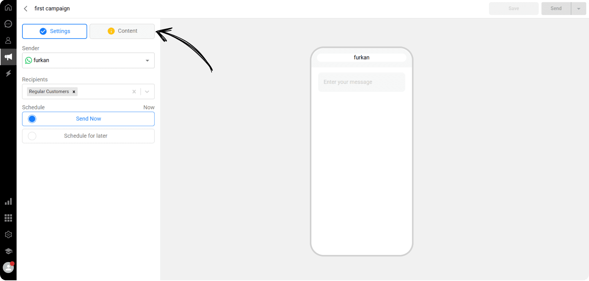 After selecting the recipients, click the “Content” button on the campaign creation screen.