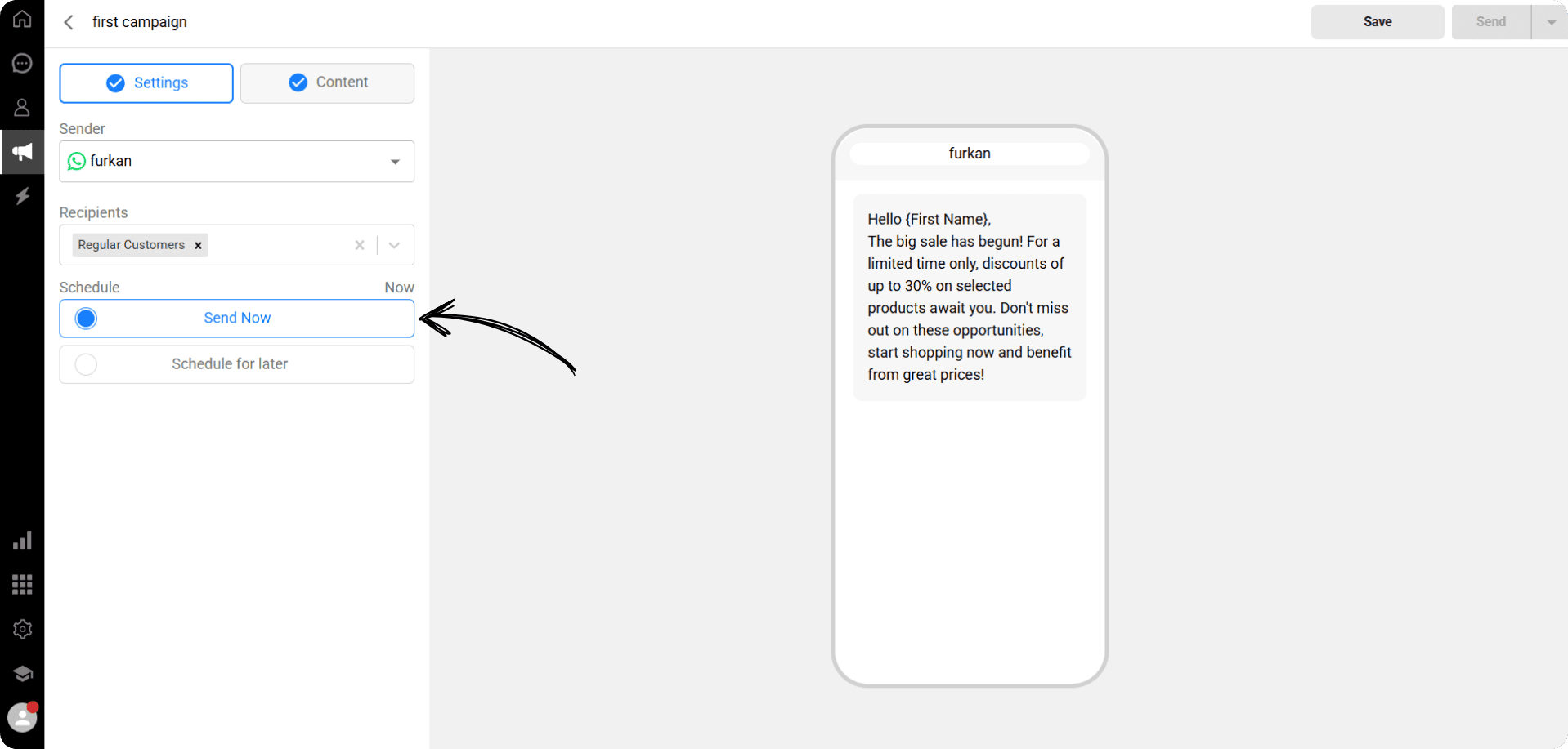 You can send campaigns that you have created or can create on the Campaigns page in bulk via the WhatsApp channel, define recipient segments, and personalise the message content.