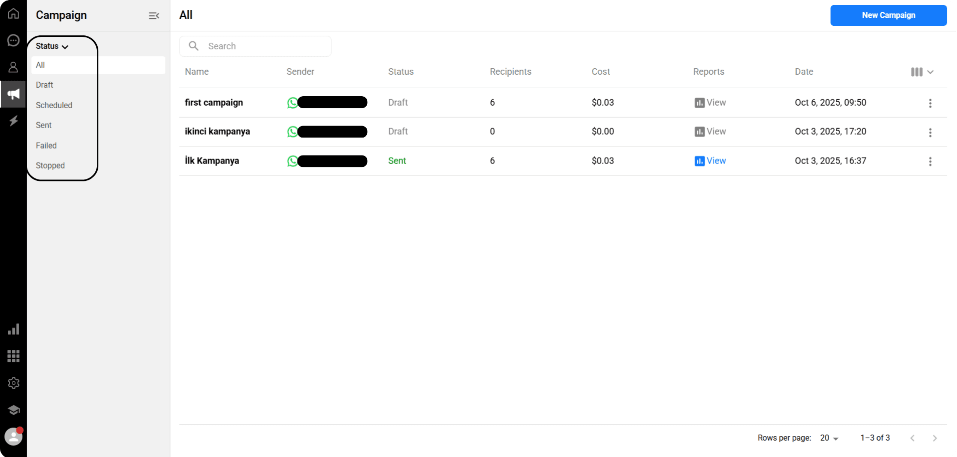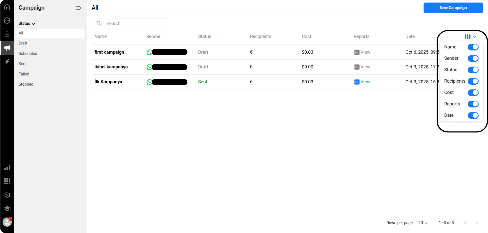 Name, Sender, Status, Number of Recipients, Cost, Reports, Date