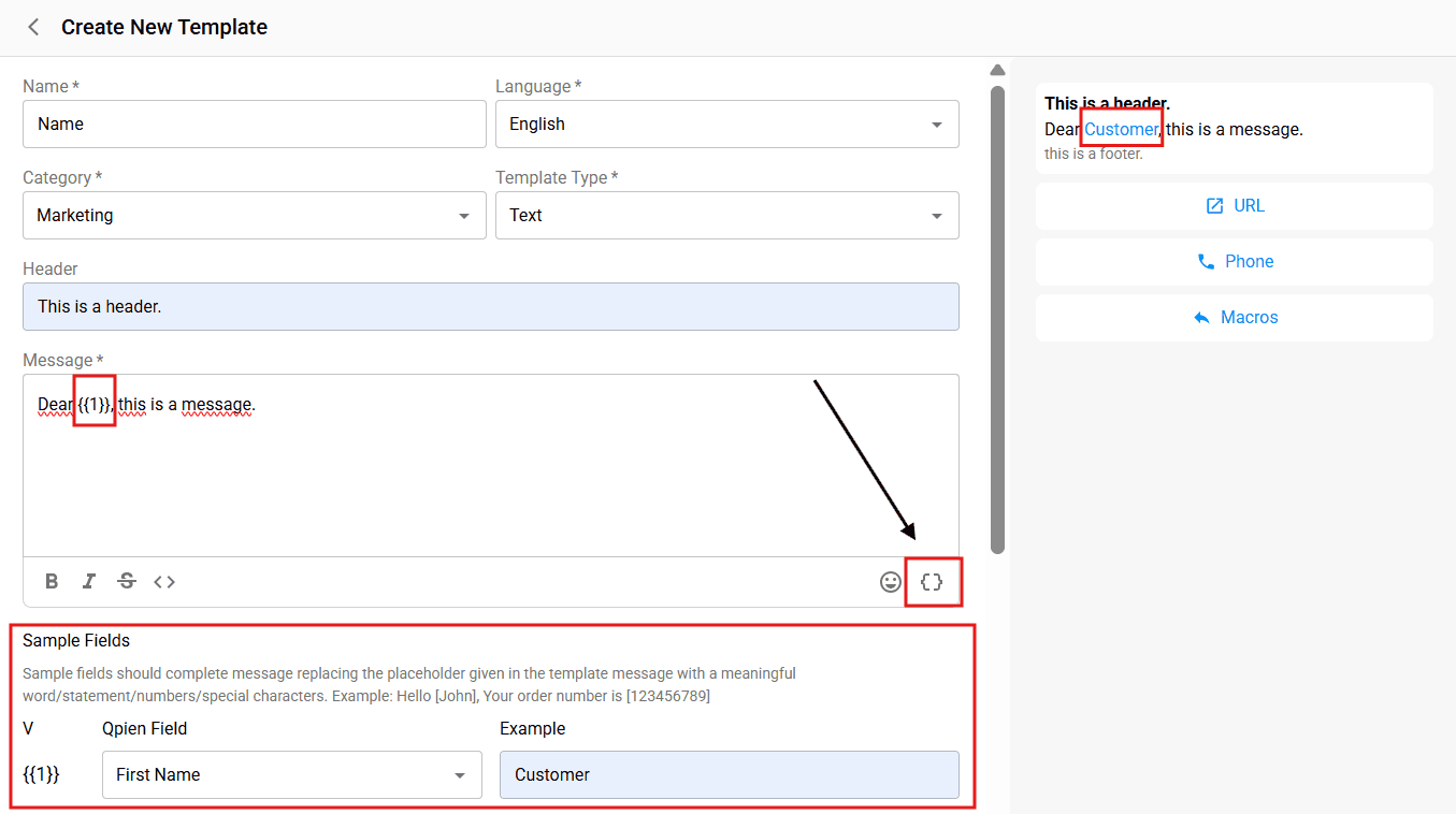Provide an Example: In the "Example" box, type a sample value (e.g., "Customer" or "John"). This helps the system validate the template and gives a real-time preview of how the message will appear to the recipient. At the same time, in cases where the variable you specify is empty, it shows the one written here by default.