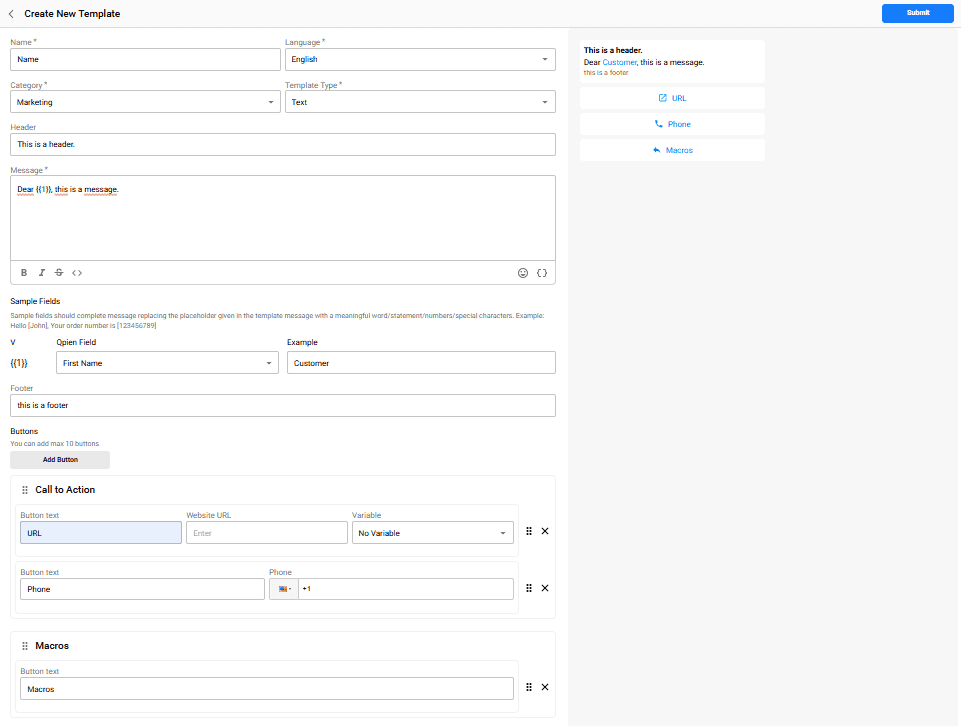 You can build your template using different media types, text variables, and interactive buttons.