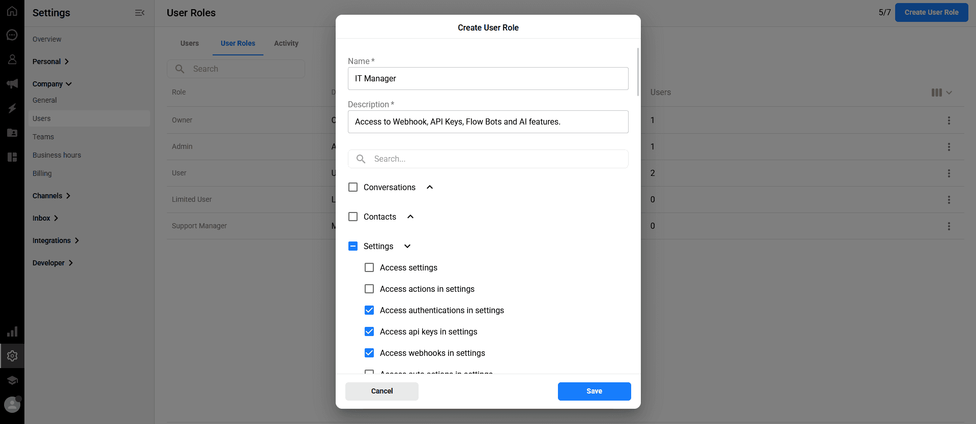 Scroll through the permission tree (e.g., Conversations, Settings, etc.) and check the boxes next to the specific permissions you want to grant to this role.