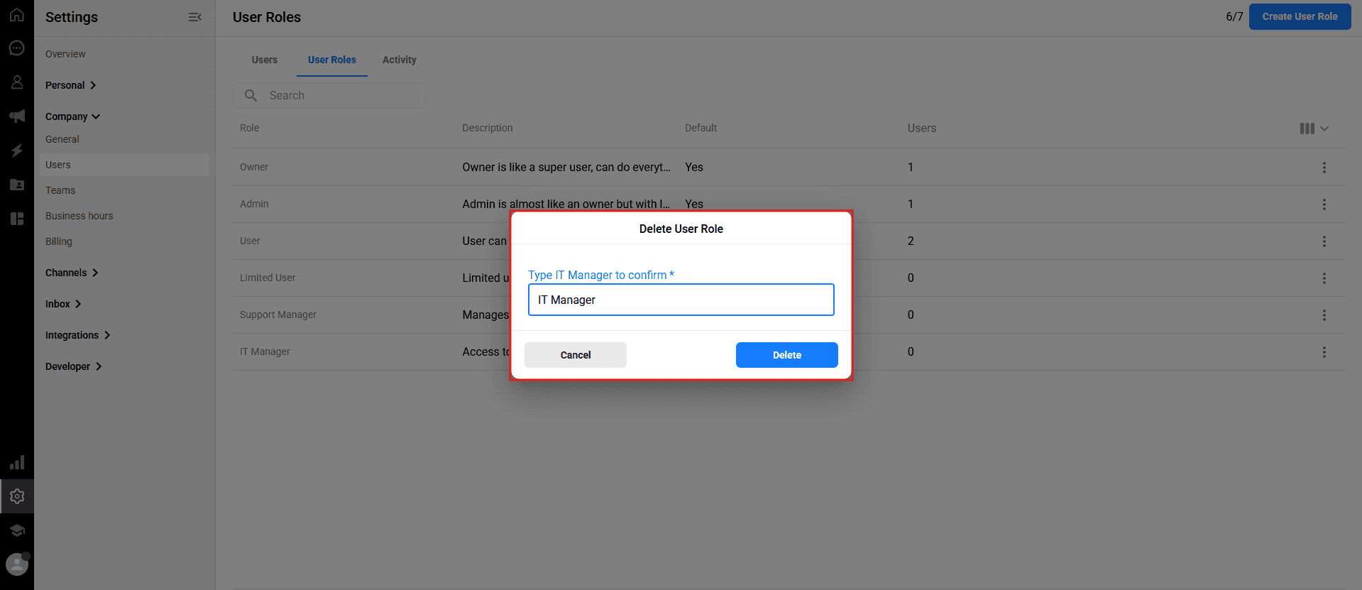 ⚠️ Important Note: You cannot delete a custom role if it is currently assigned to any active user. To delete the role, you must first reassign those users to a different role (e.g., changing them back to a "User" or "Admin" role) so that the custom role is no longer in use.