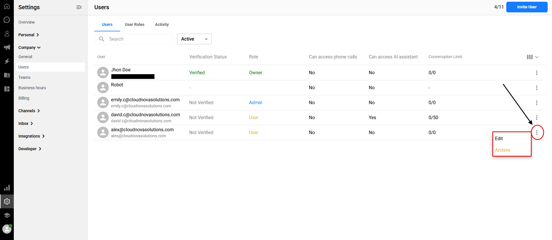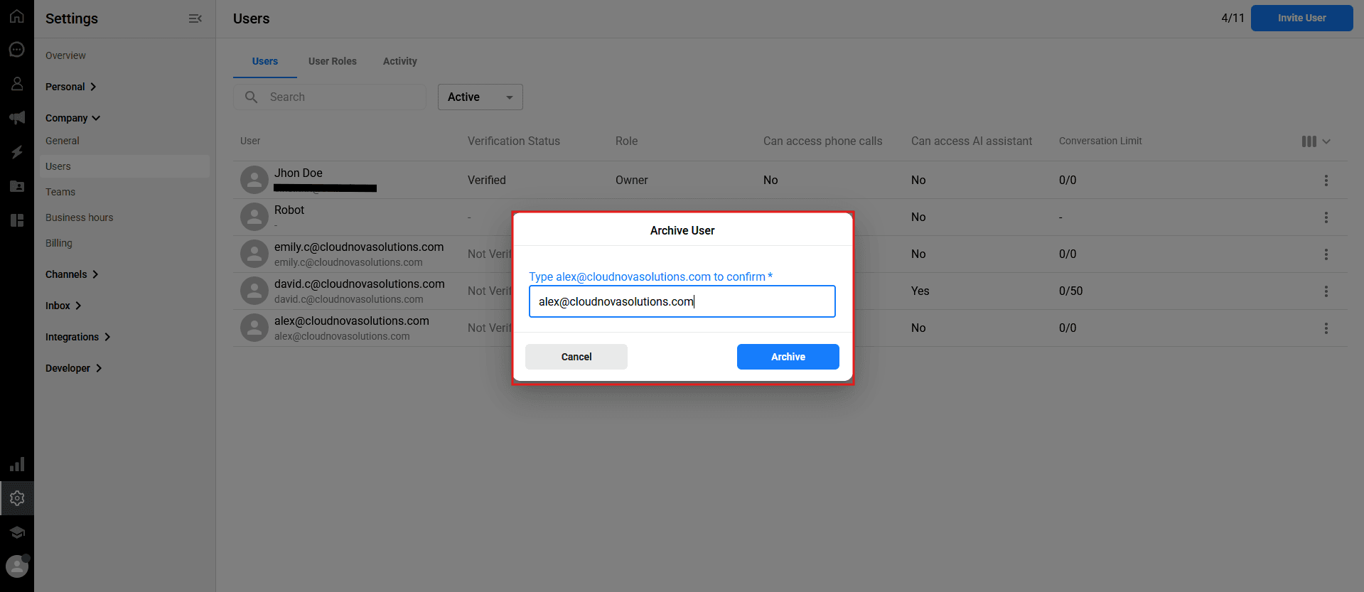 If a team member changes roles or leaves the company, you can quickly remove their access by archiving them. Archiving a user safely preserves their past activity and conversation history within the system, while permanently preventing them from logging in.