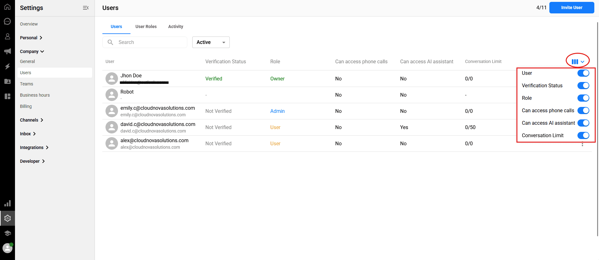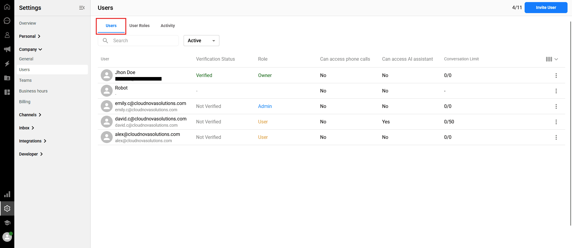 To view and manage your team members, navigate to Settings > Company > Users from the left sidebar of your dashboard, and ensure you are on the "Users" tab.