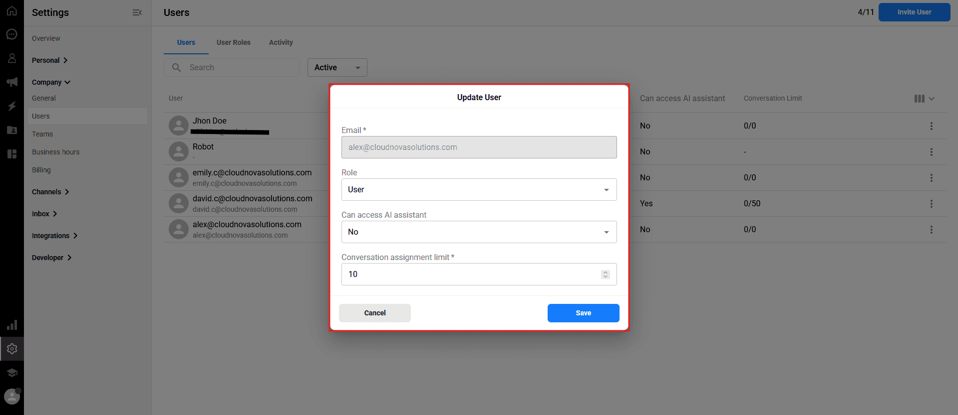 In the "Update User" modal, you can change their Role using the dropdown menu, or type a new number into the Conversation Limit field.
