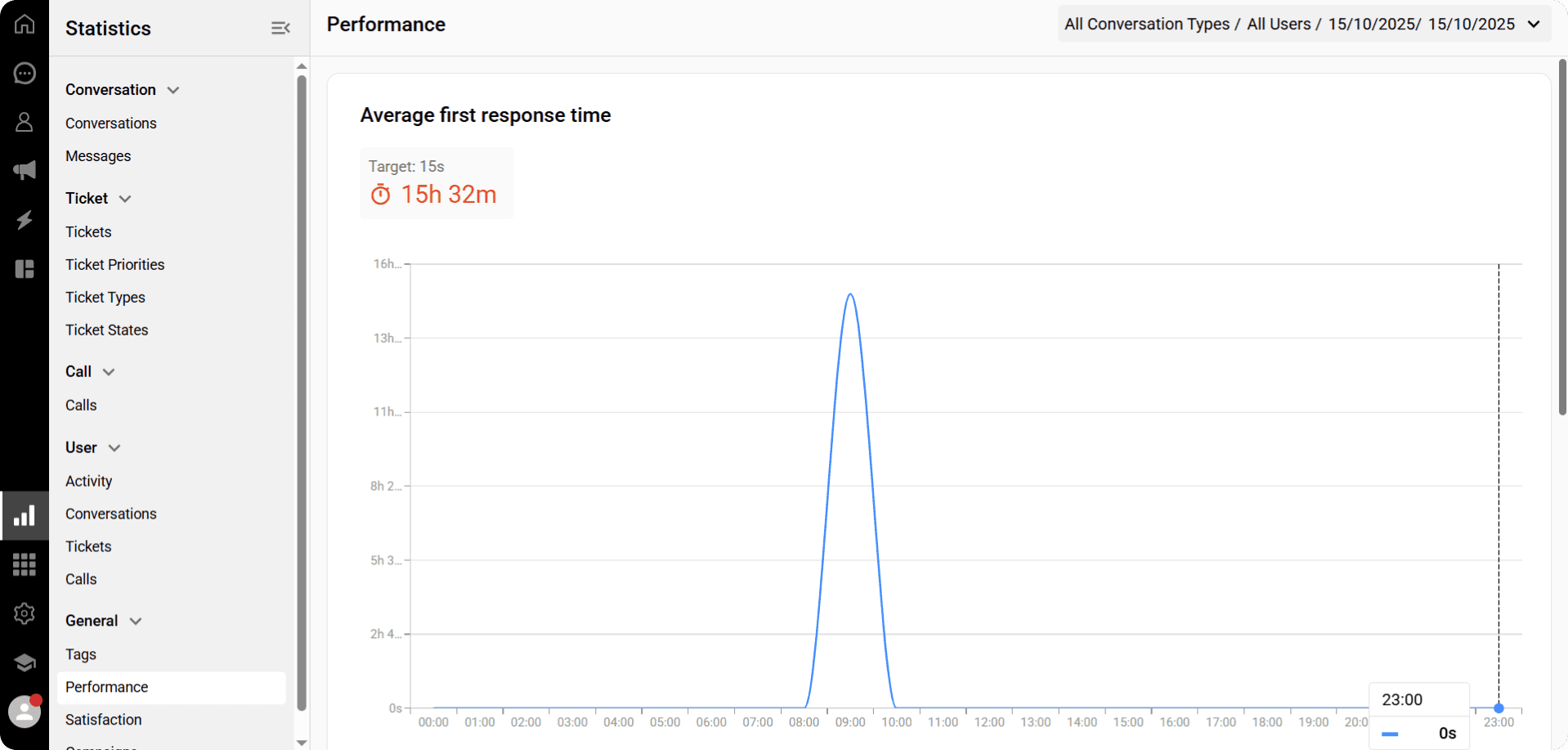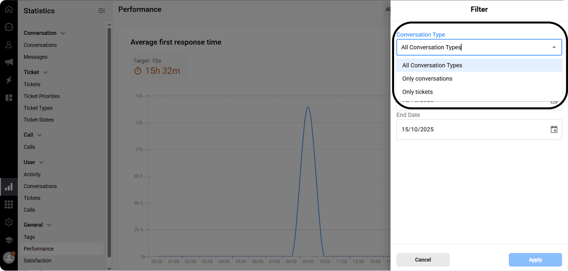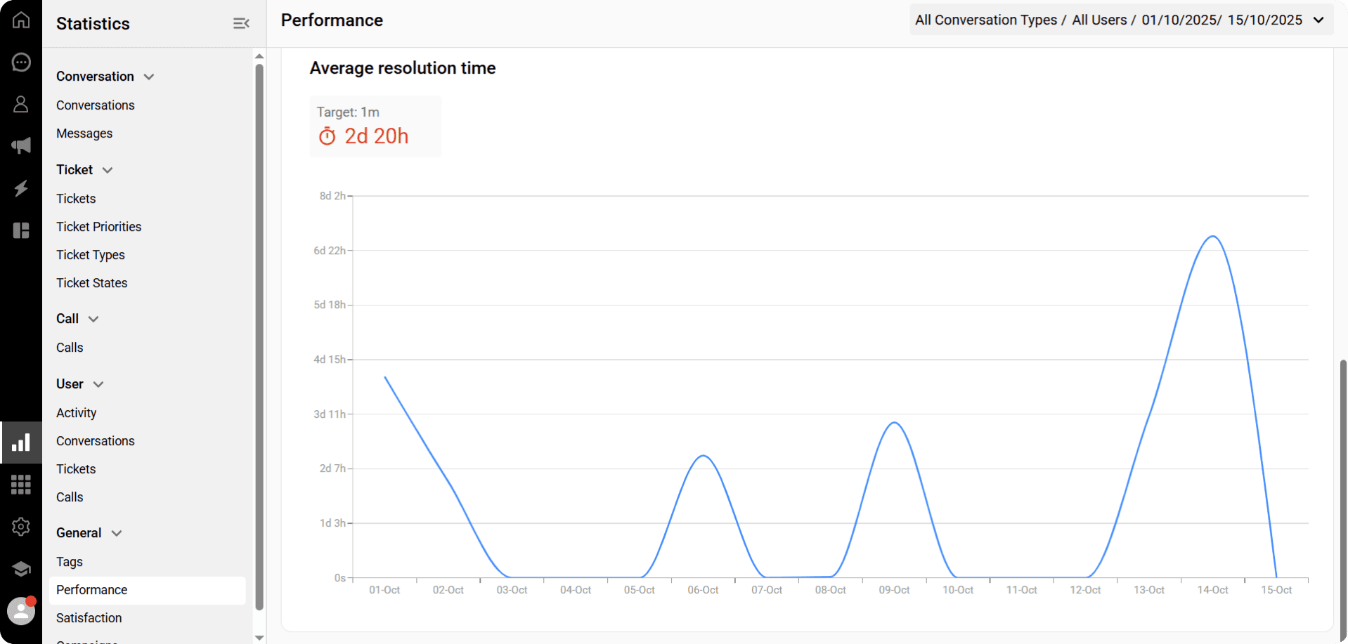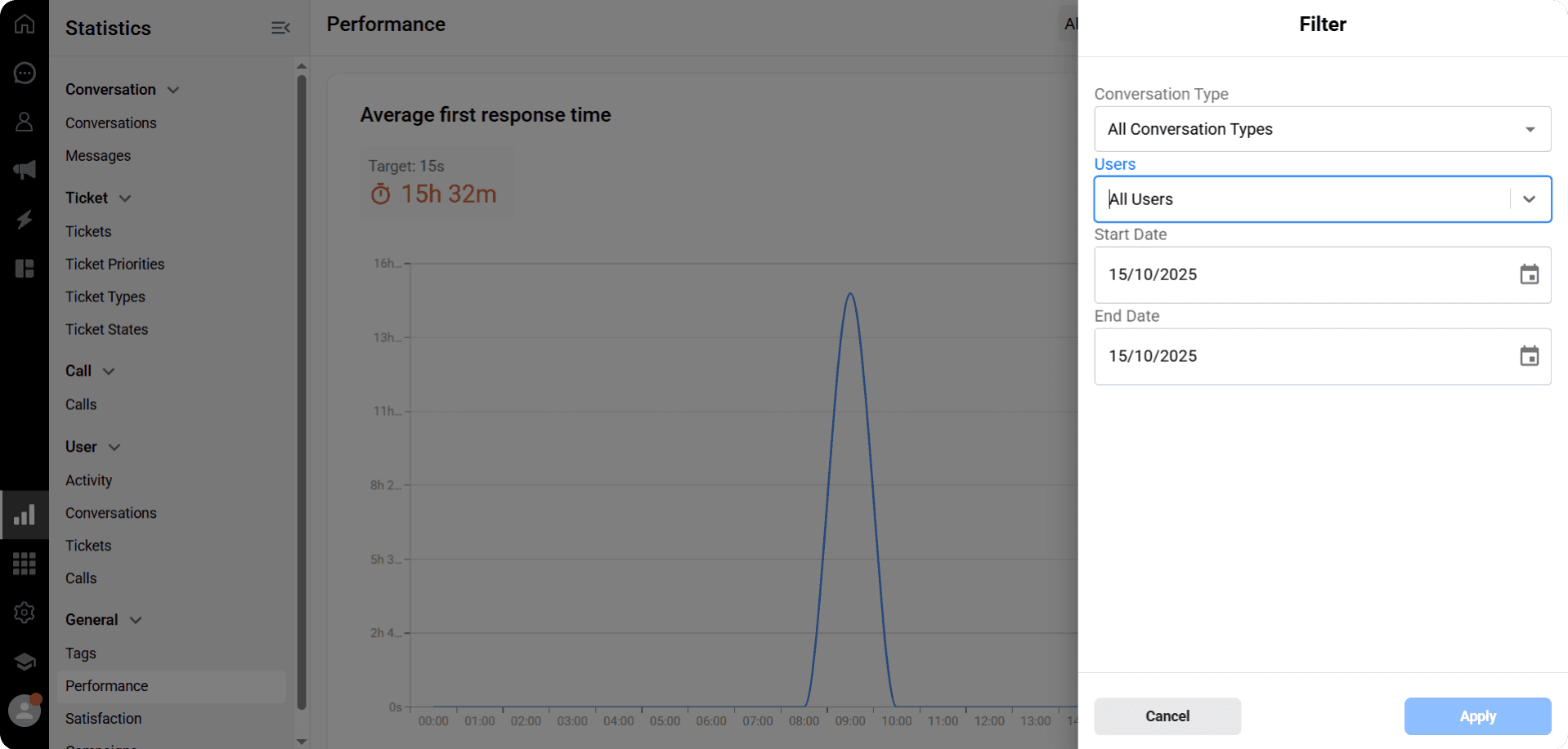 View reports on average response and resolution times, with customizable filters for users and dates.