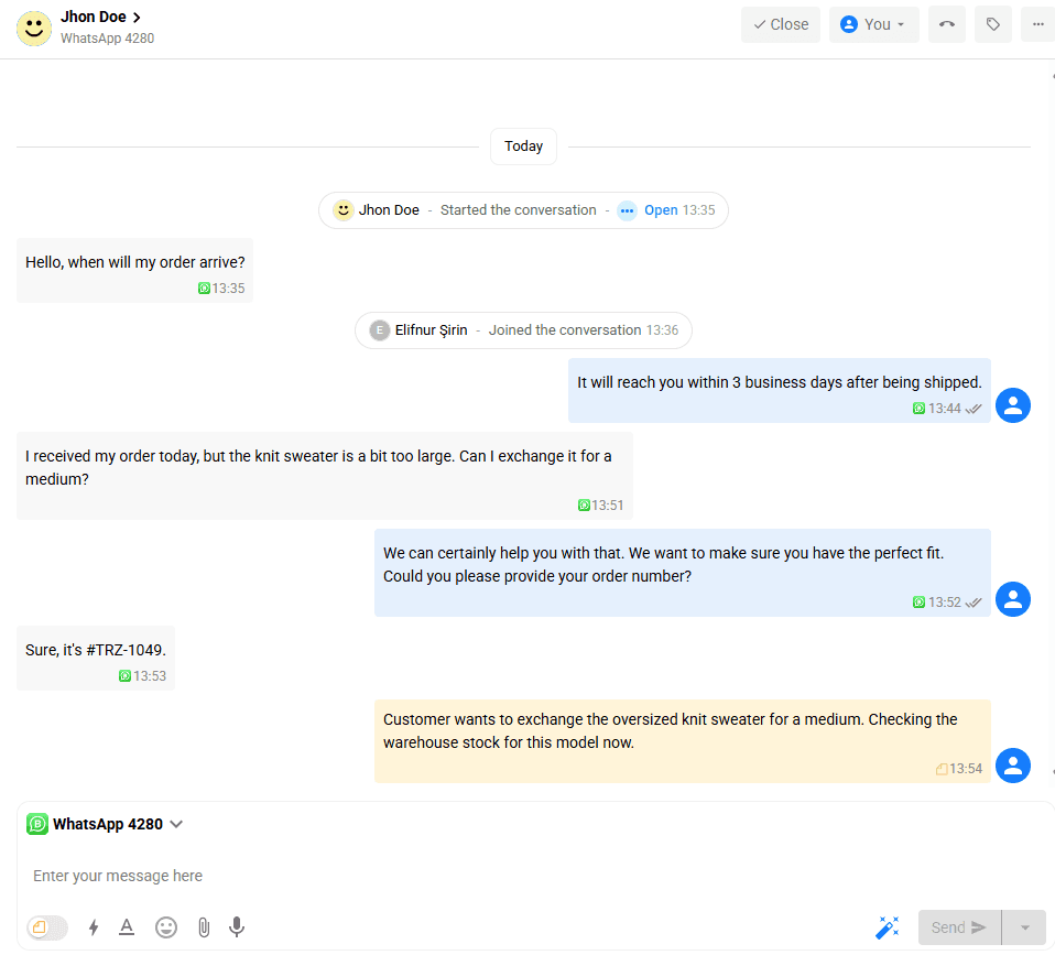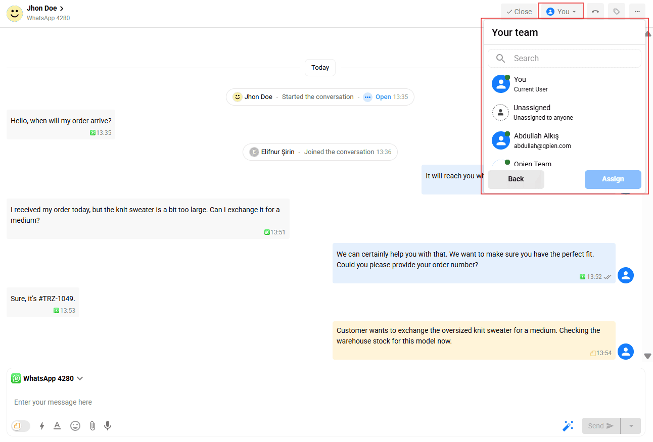 Conversations are automatically routed to the team you selected during the initial WhatsApp setup. Only members of that assigned team will see the incoming WhatsApp messages in their inbox. If you need to transfer a specific conversation to another department (e.g., from Support to Sales), you can manually reassign the conversation from the right-hand details panel.