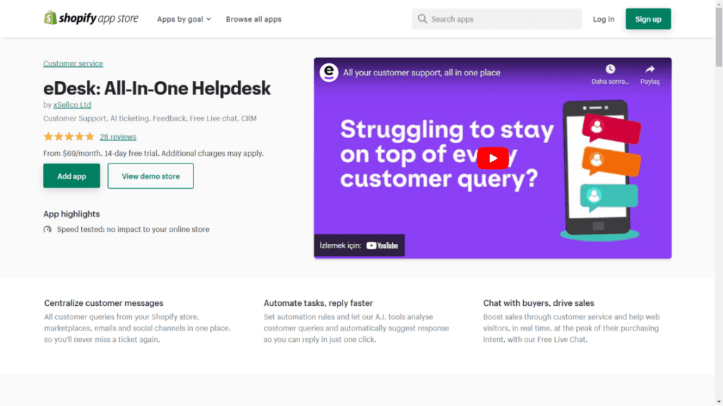 Çok kanallı destek ve üçüncü taraf entegrasyonları, talep yönetimi, e-posta yönetimi, müşter takibi gibi özelliklere sahiptir. E-ticaret’e özel olarak geliştirilmiştir ve e-ticaret mağaza sahibi kullanıcılarının gereksinimlerini esas alır.