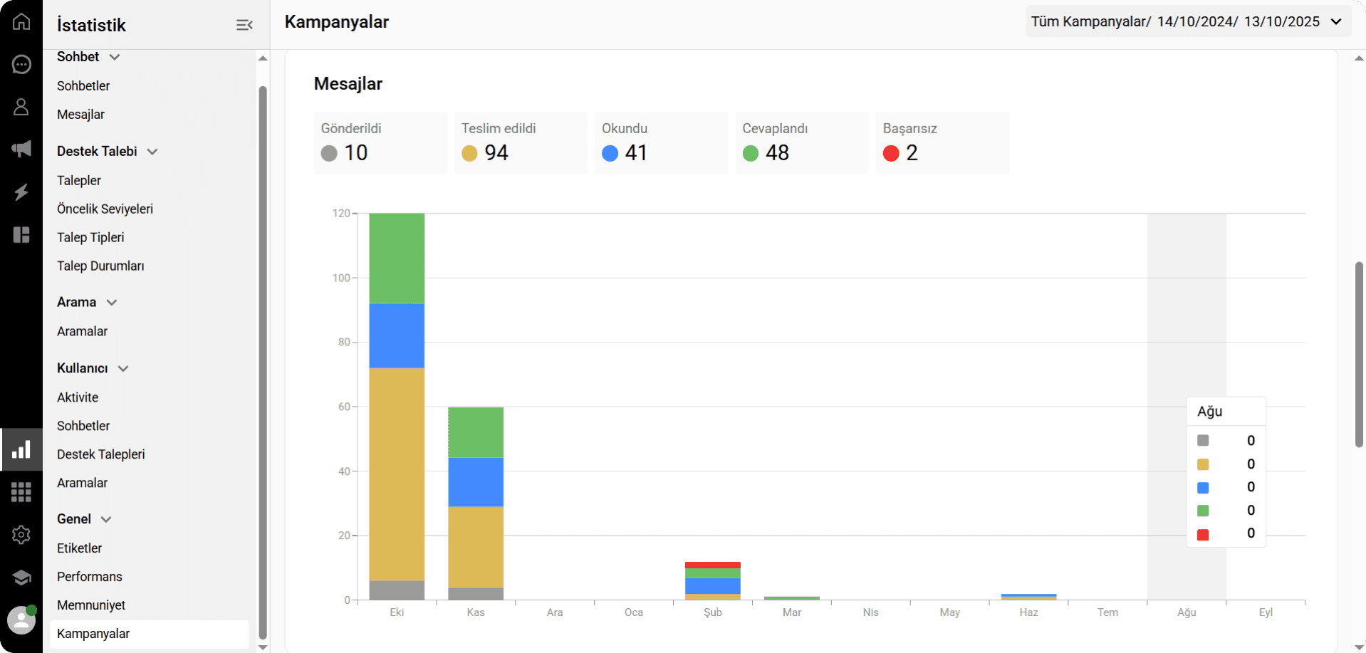 Mesajlar raporunda kampanya mesajlarımızdan gönderilenlerin, teslim edilenlerin, okunanların, cevaplananların ve başarısız olanların sayılarını ve grafiğini görebiliyoruz.