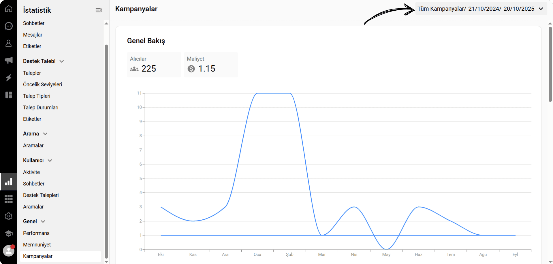 Filtreleme kısmında daha önceki kampanyalarımızdan seçim yaparak onun raporlarına bakabiliriz veya tüm kampanyalarımızın raporlarını oluşturabiliriz.