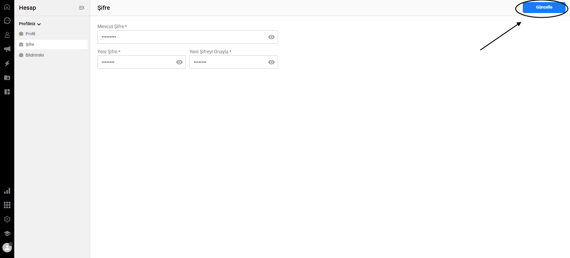 ⚠️ Eğer iki şifre birebir eşleşmezse, “Şifreler Eşleşmiyor” uyarısı alırsınız ve sağ üstteki “Güncelle” butonu aktif olmaz