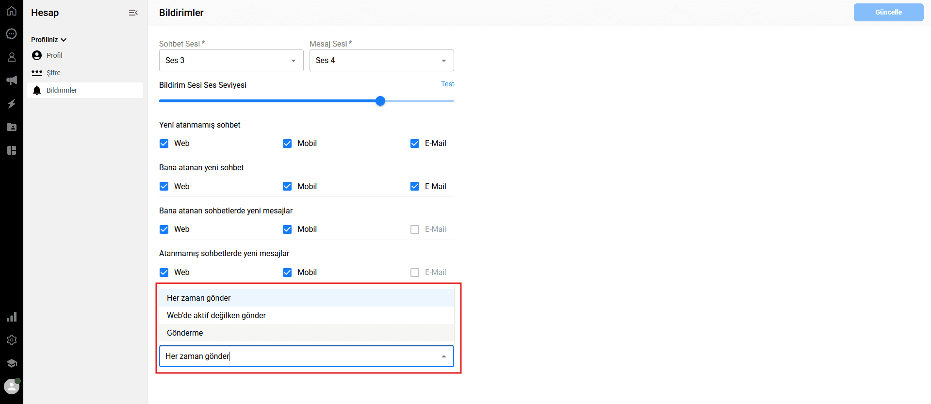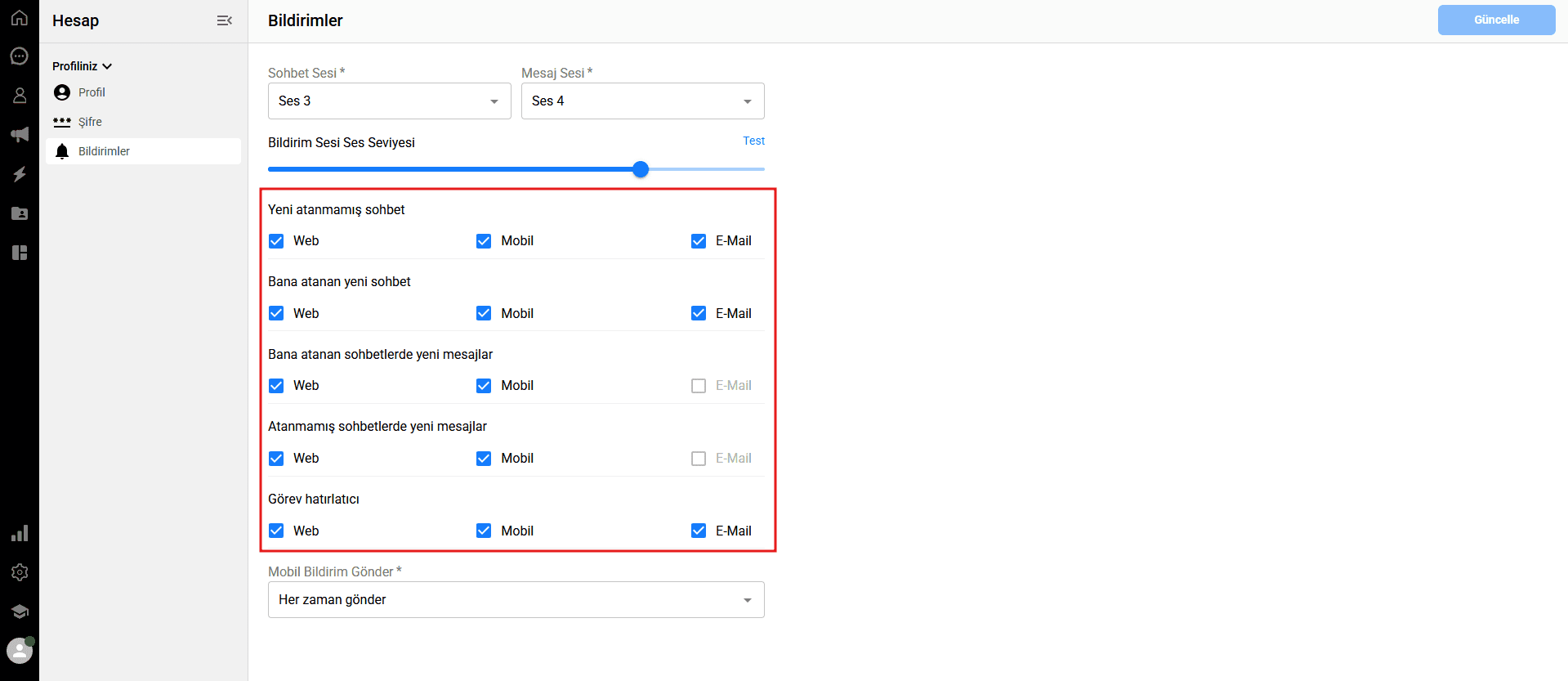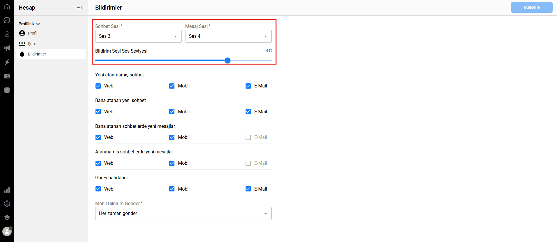 Bildirim ses seviyesi: Bildirimlerin ne kadar yüksek sesle çalacağını ayarlamak için kaydırıcıyı kullanın. Seçtiğiniz ses seviyesini ve tonları duymak için kaydırıcının yanındaki mavi Test bağlantısına tıklayabilirsiniz.