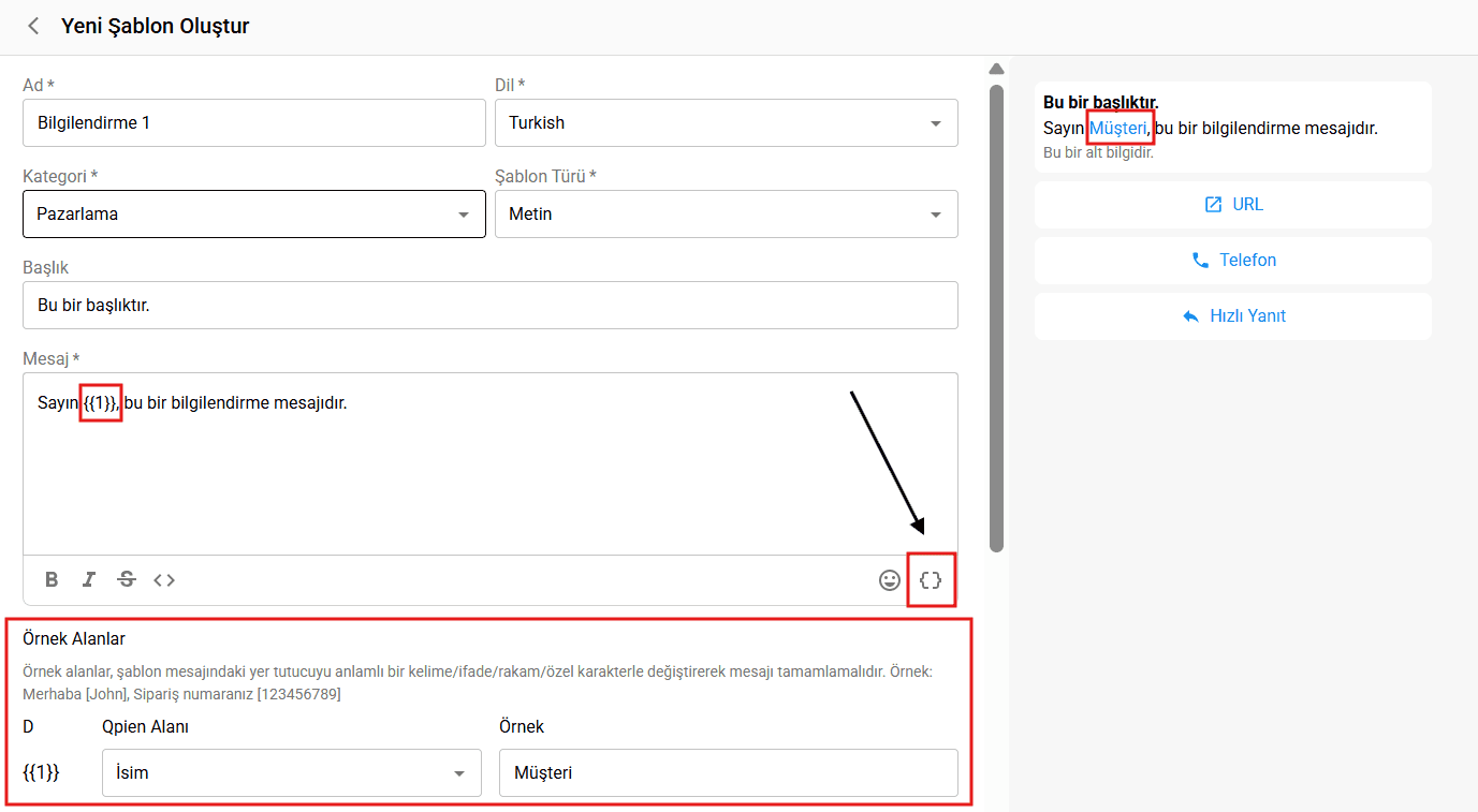 Bir Örnek Ayarlayın: "Örnek" kutusuna bir örnek değer yazın (örneğin, "Müşteri" veya "John"). Bu, sistemin şablonu doğrulamasına yardımcı olur ve mesajın alıcıya nasıl görüneceğine dair gerçek zamanlı bir önizleme sunar. Aynı zamanda belirttiğiniz değişkenin boş olduğu durumlarda varsayılan olarak burada yazılanı gösterir.