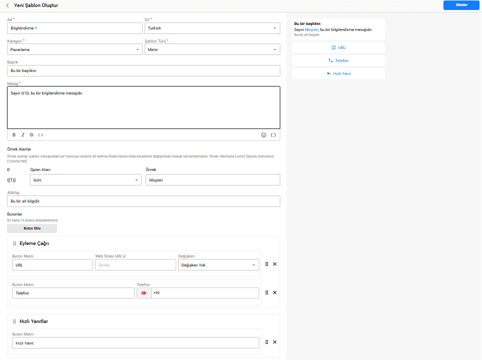 URL Butonları: Maksimum 2 adet URL butonu ekleyebilirsiniz.