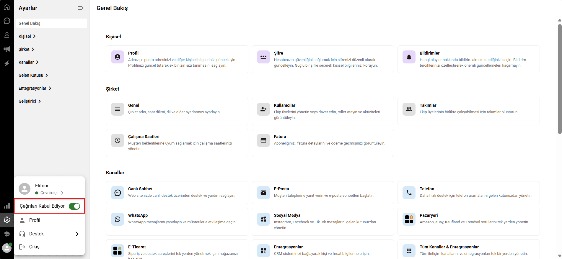 Çalışma alanınızda telefon entegrasyonları etkinse sesli aramalar için uygunluk durumunuzu doğrudan hızlı erişim panelinden yönetebilirsiniz.