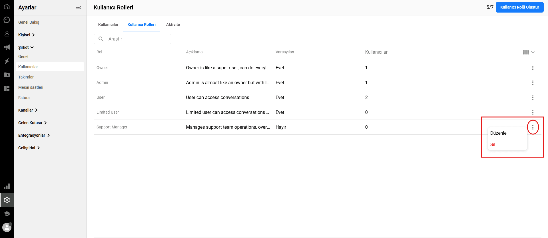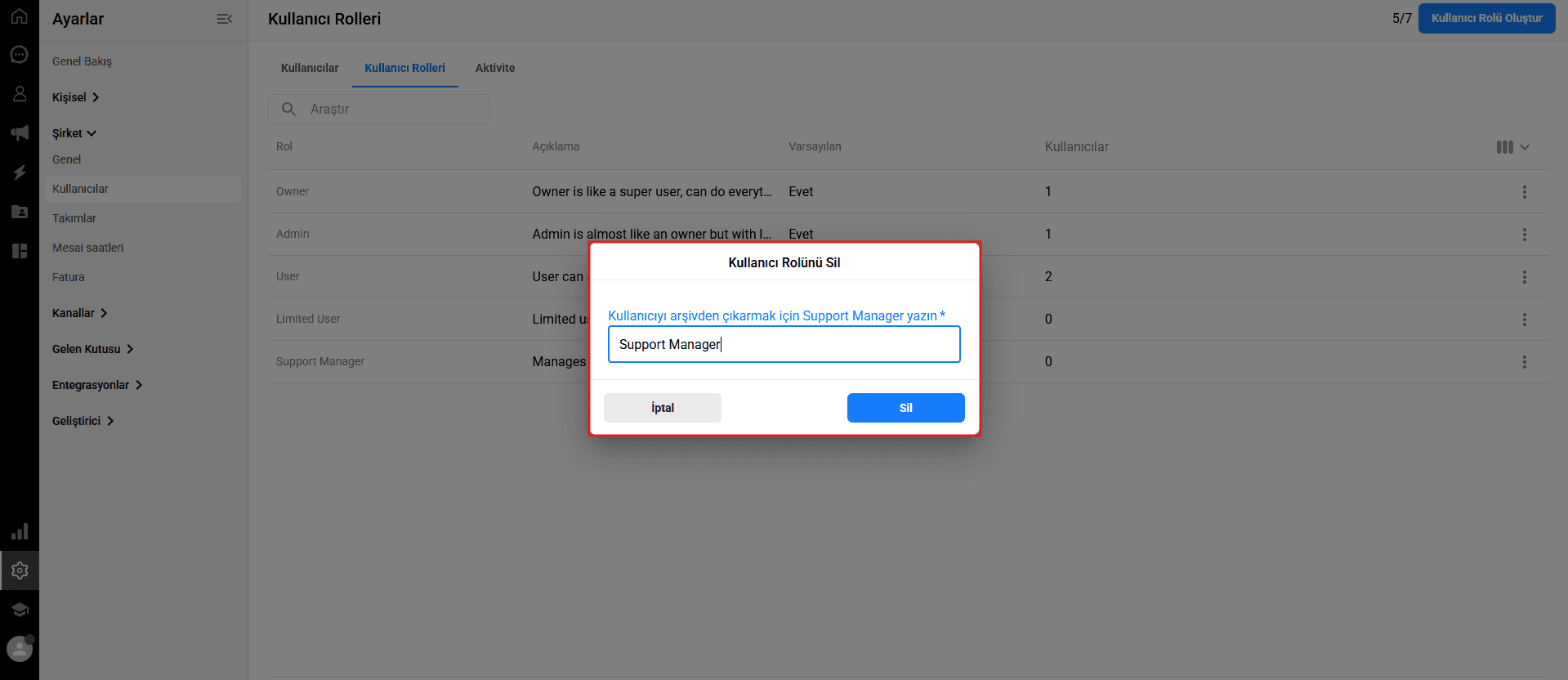⚠️ Önemli Not: Eğer oluşturduğunuz özel rol şu anda aktif bir kullanıcıya atanmışsa, bu rolü silemezsiniz. Rolü silebilmek için öncelikle o kullanıcıları farklı bir role (örneğin "Kullanıcı" veya "Yönetici") atayarak söz konusu özel rolü kullanımdan çıkarmanız gerekir.