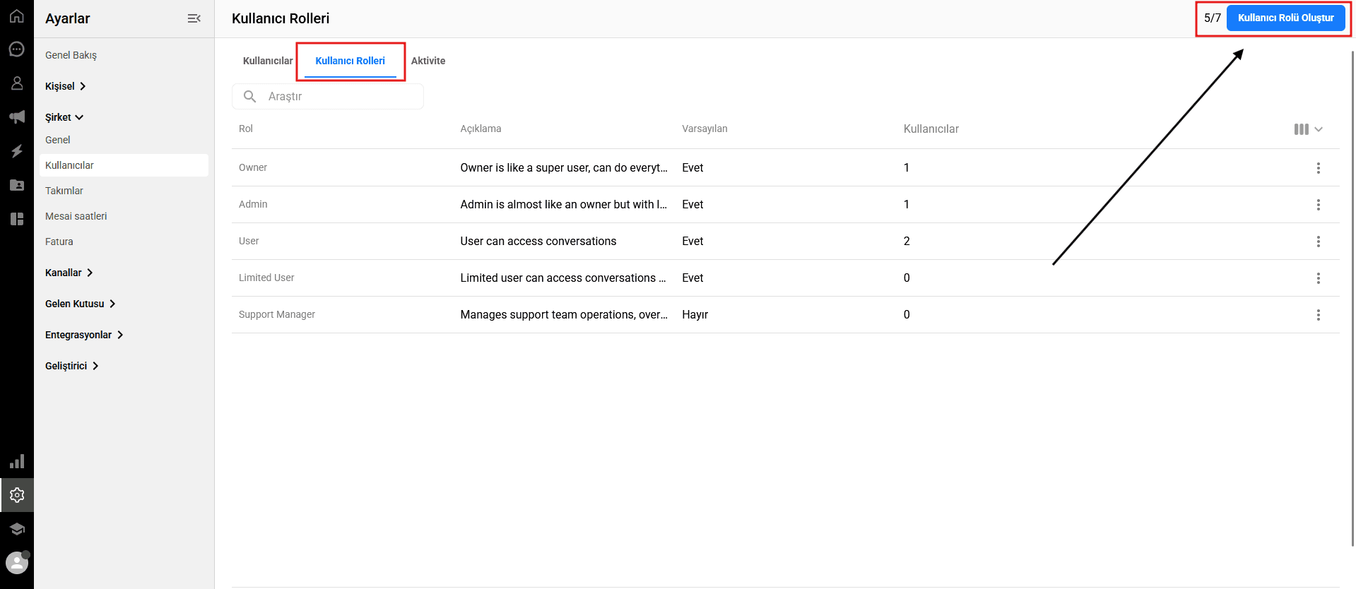 Sistem rollerini ve izinlerini yönetmek için panelinizin sol kenar çubuğundan Ayarlar > Şirket > Kullanıcılar adımlarını izleyin ve ardından üst kısımdaki Kullanıcı Rolleri sekmesine tıklayın.