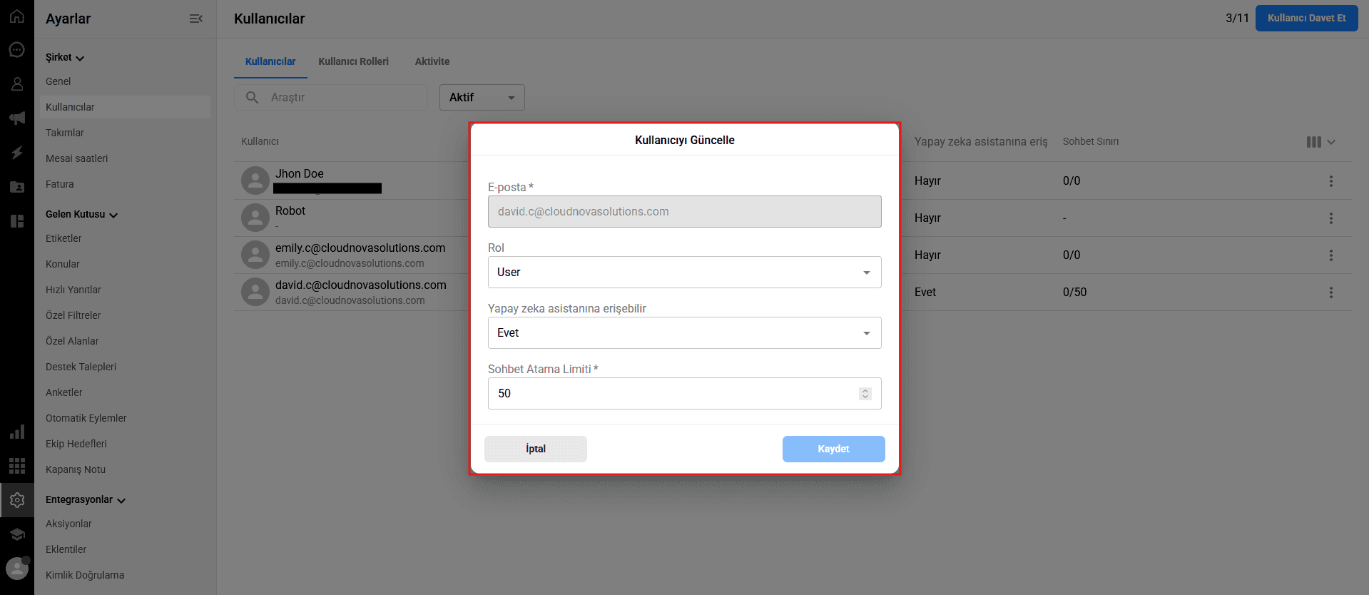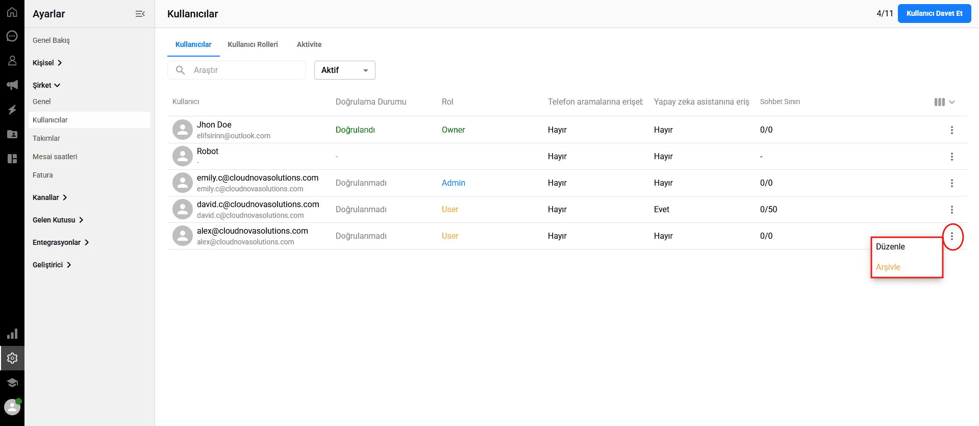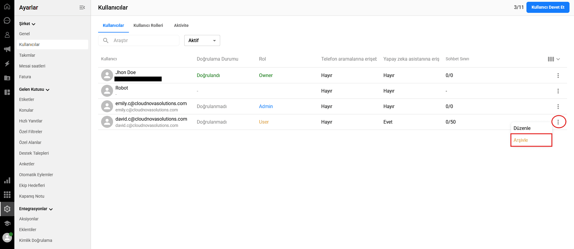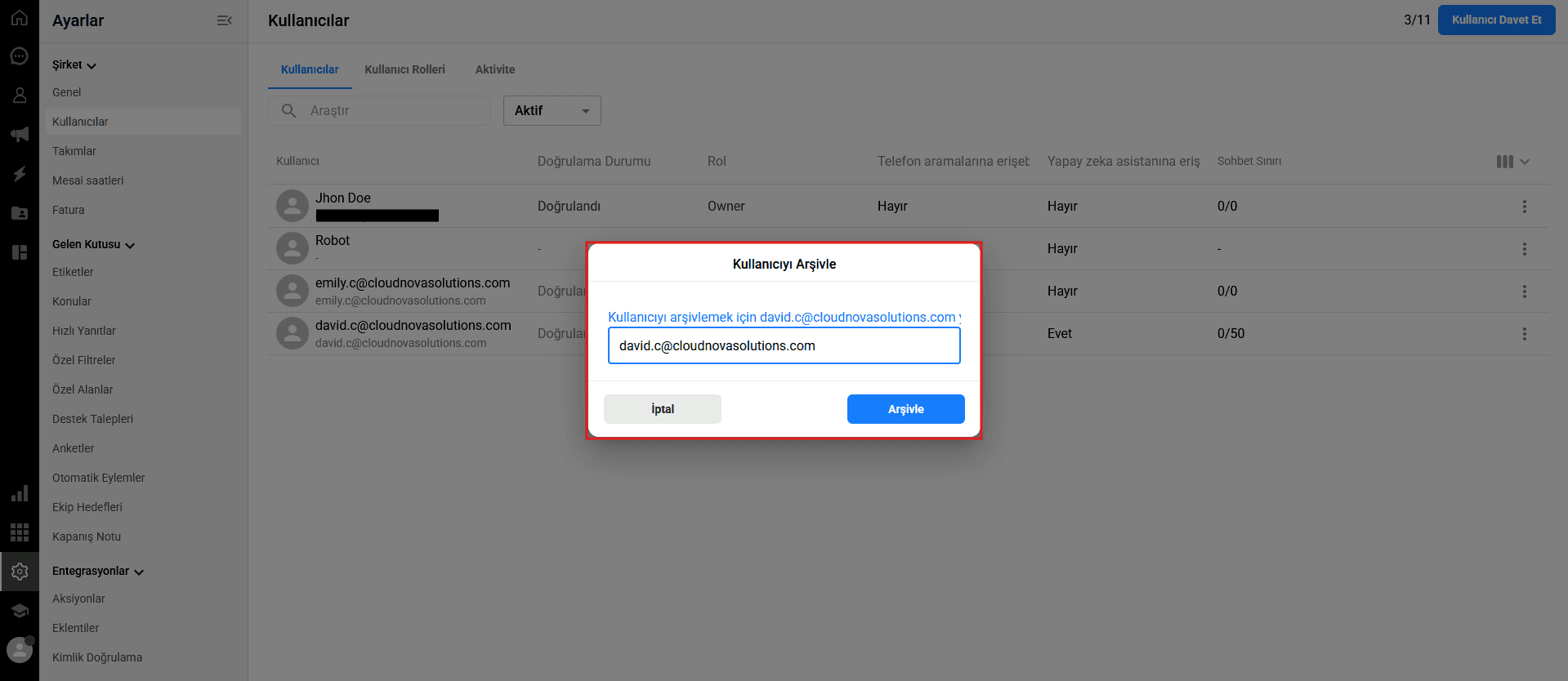 Bir ekip üyesi rol değiştirdiğinde veya şirketten ayrıldığında, onu arşivleyerek erişimini hızlıca kaldırabilirsiniz. Bir kullanıcıyı arşivlemek, geçmiş aktivitelerini ve sohbet geçmişini sistem içinde güvenle korurken, sisteme giriş yapmasını kalıcı olarak engeller.