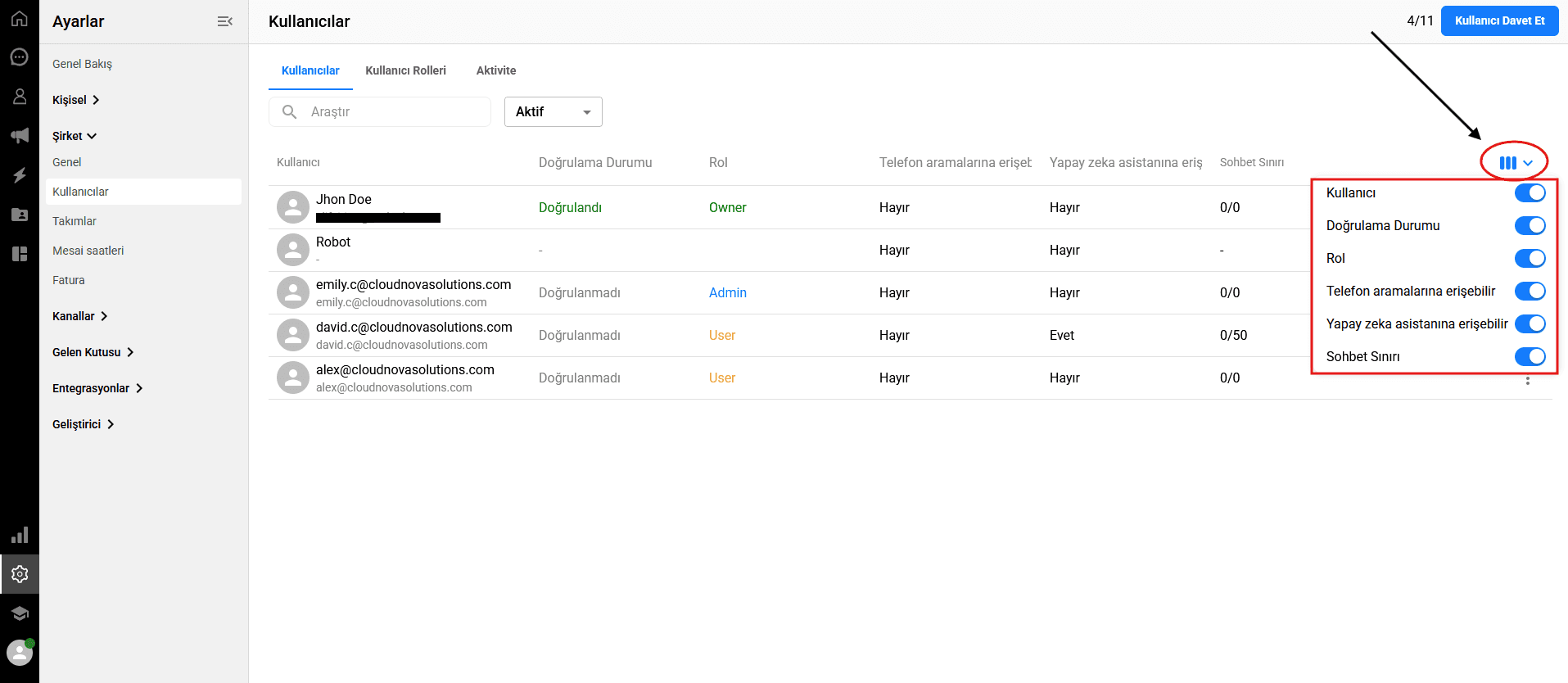 Ana görünümünüzde o sütunu gizlemek veya görüntülemek için her seçeneğin (Rol, Doğrulama Durumu vb.) yanındaki anahtarları değiştirin.