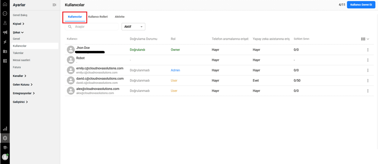 Ekip üyelerinizi görüntülemek ve yönetmek için panelinizin sol kenar çubuğundan Ayarlar > Şirket > Kullanıcılar adımlarını izleyin ve Kullanıcılar sekmesinde olduğunuzdan emin olun.