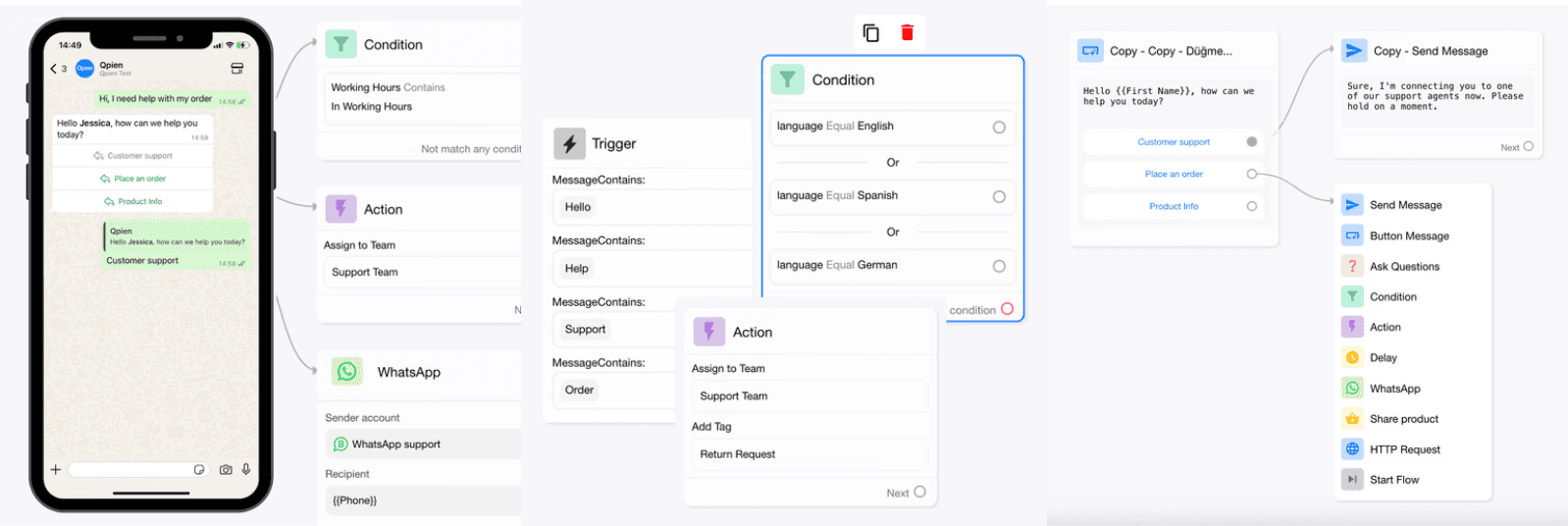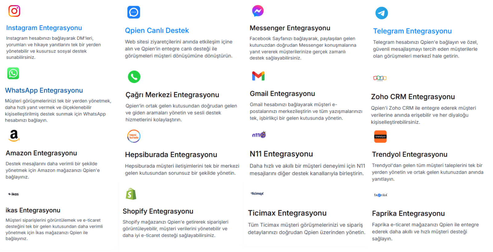 Qpien; müşteri iletişimlerinizi merkezileştirmek ve ekibinizin iş akışını kolaylaştırmak için tasarlanmış; hepsi bir arada bir omnichannel destek, satış ve otomasyon platformudur. İşte temel ürünlerimizin dökümü ve olağanüstü müşteri deneyimleri sunmak için nasıl bir arada çalştıkları: