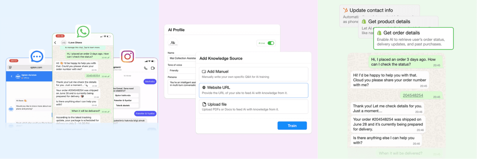 E-ticaret Senkronizasyonu: Sipariş geçmişlerini, takip numaralarını ve sepet detaylarını sohbet penceresinin hemen yanında görüntülemek için Shopify, Ticimax ve T-Soft gibi platformlarla doğrudan entegre olun.