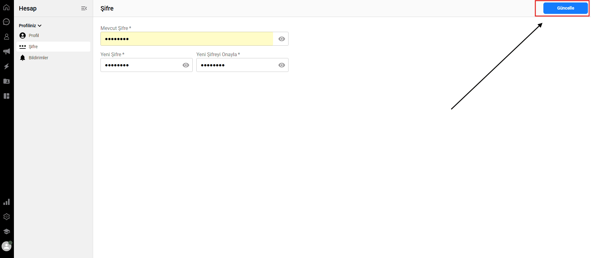 İki yeni şifre birbiriyle tam olarak eşleşmezse, "Şifreler Eşleşmiyor" uyarısı alırsınız ve sağ üst köşedeki "Güncelle" butonu aktif olmaz.