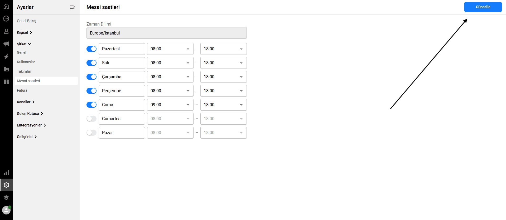 -> Sol kenar çubuğundan Ayarlar > Şirket > Mesai saatleri menüsüne gidin.