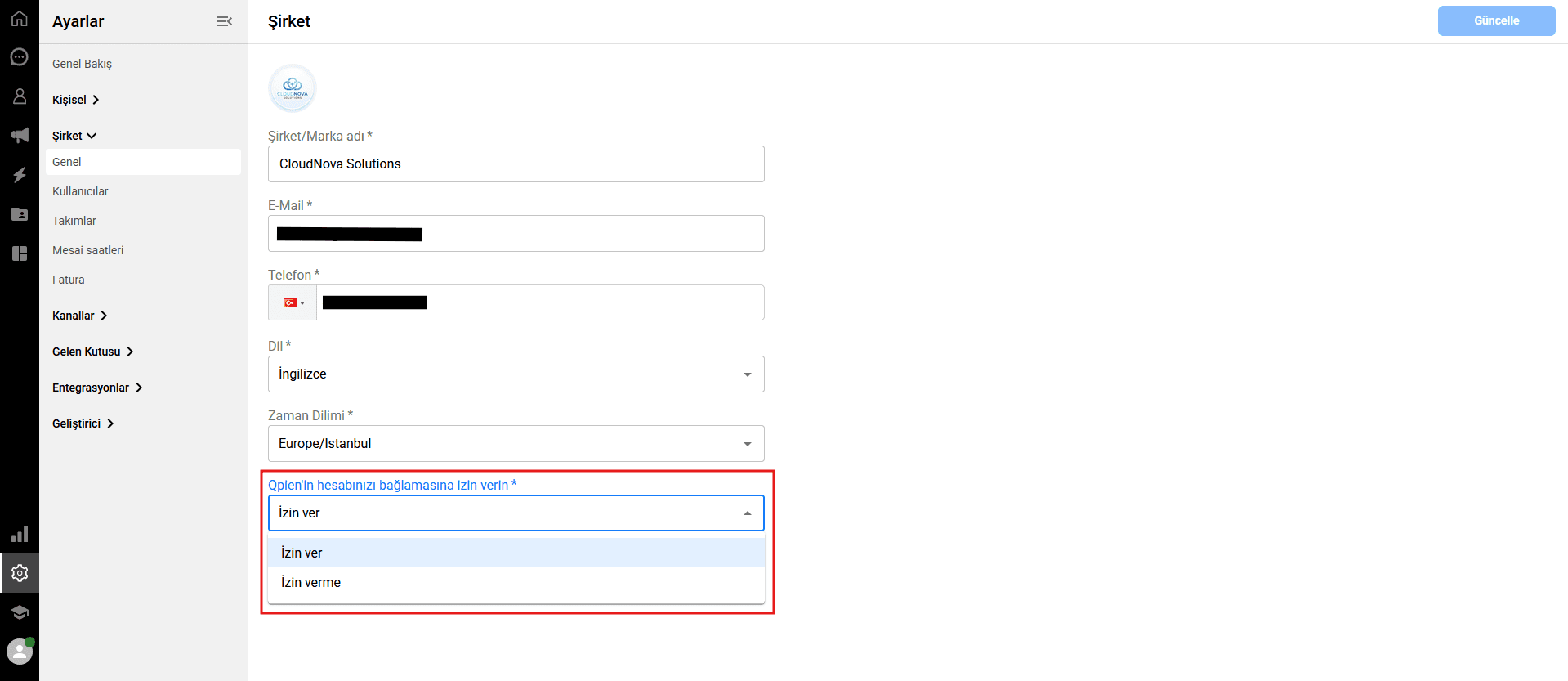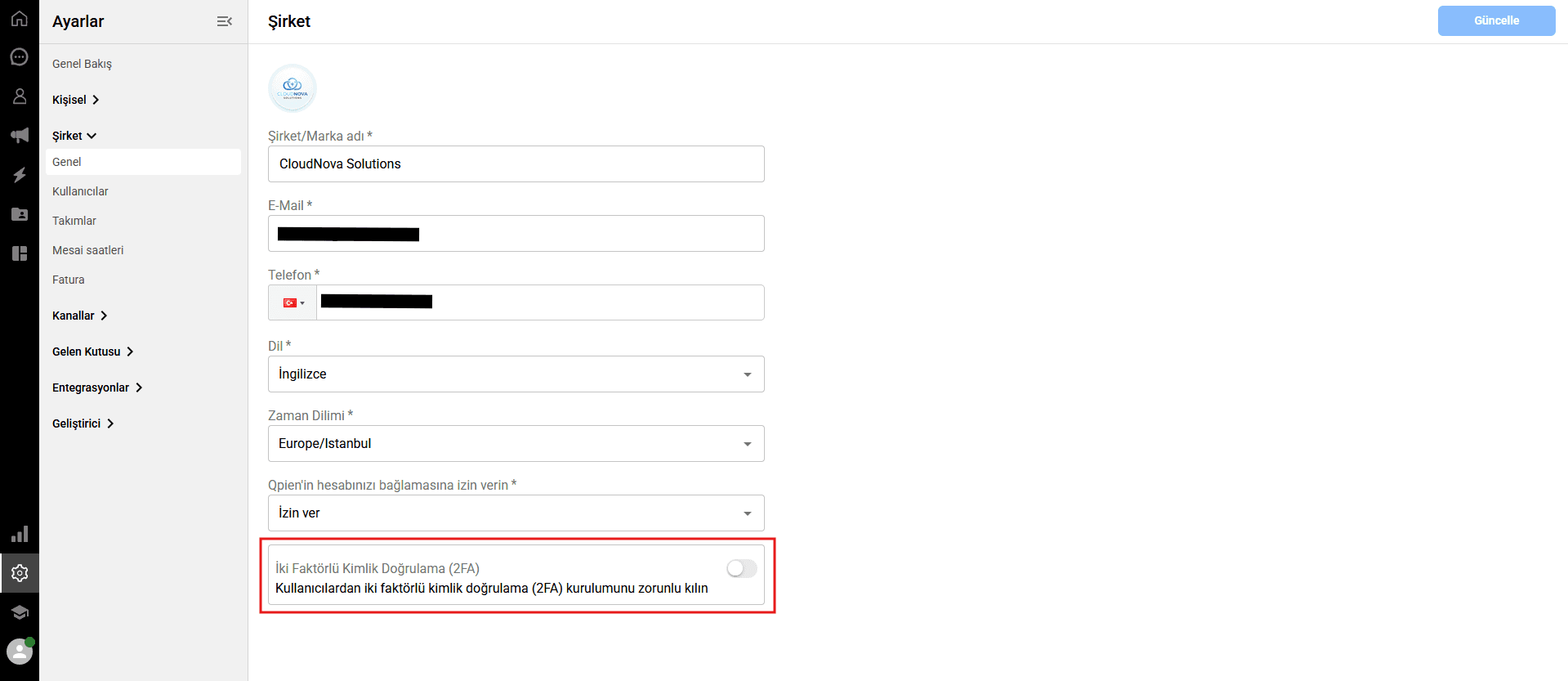 Genel ayarlar sayfasında, temel şirket bilgilerinizi güncelleyebilirsiniz: