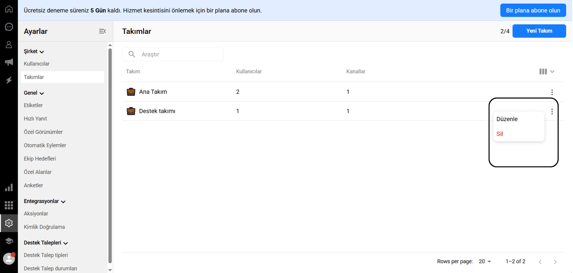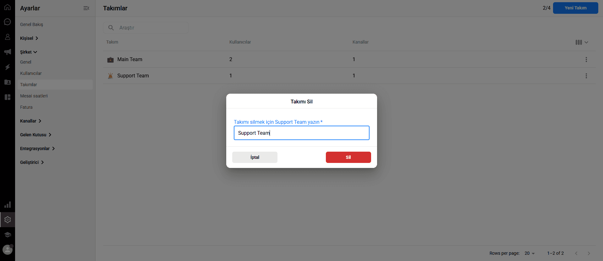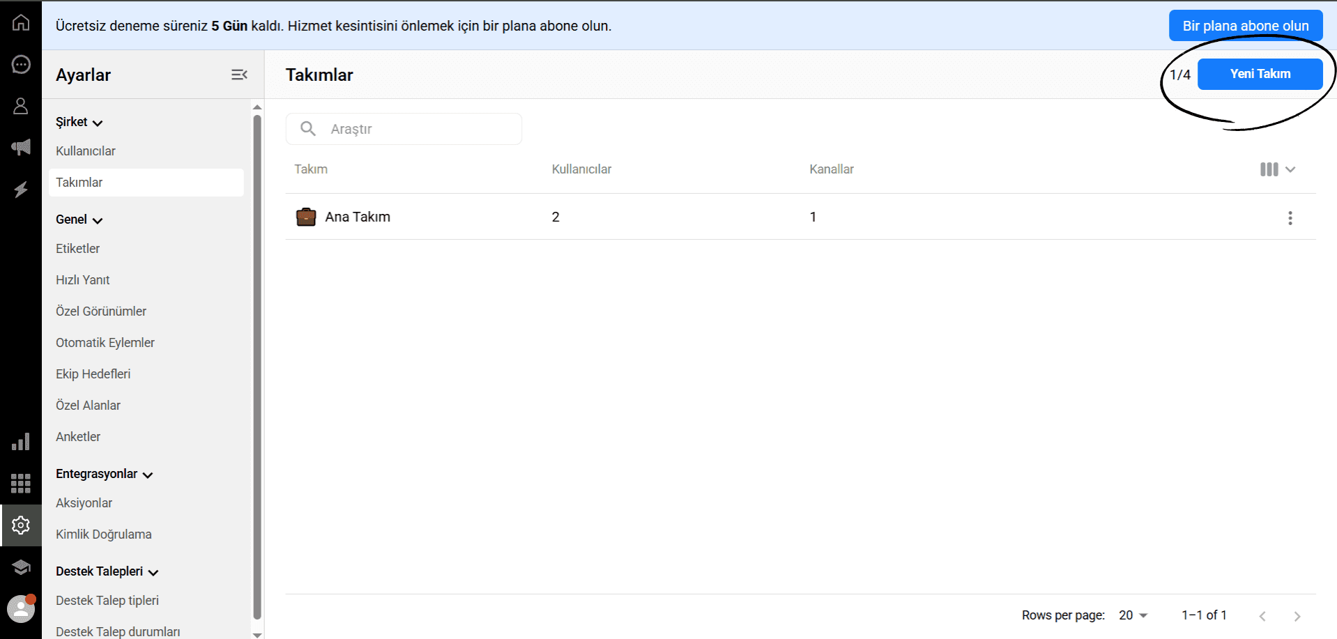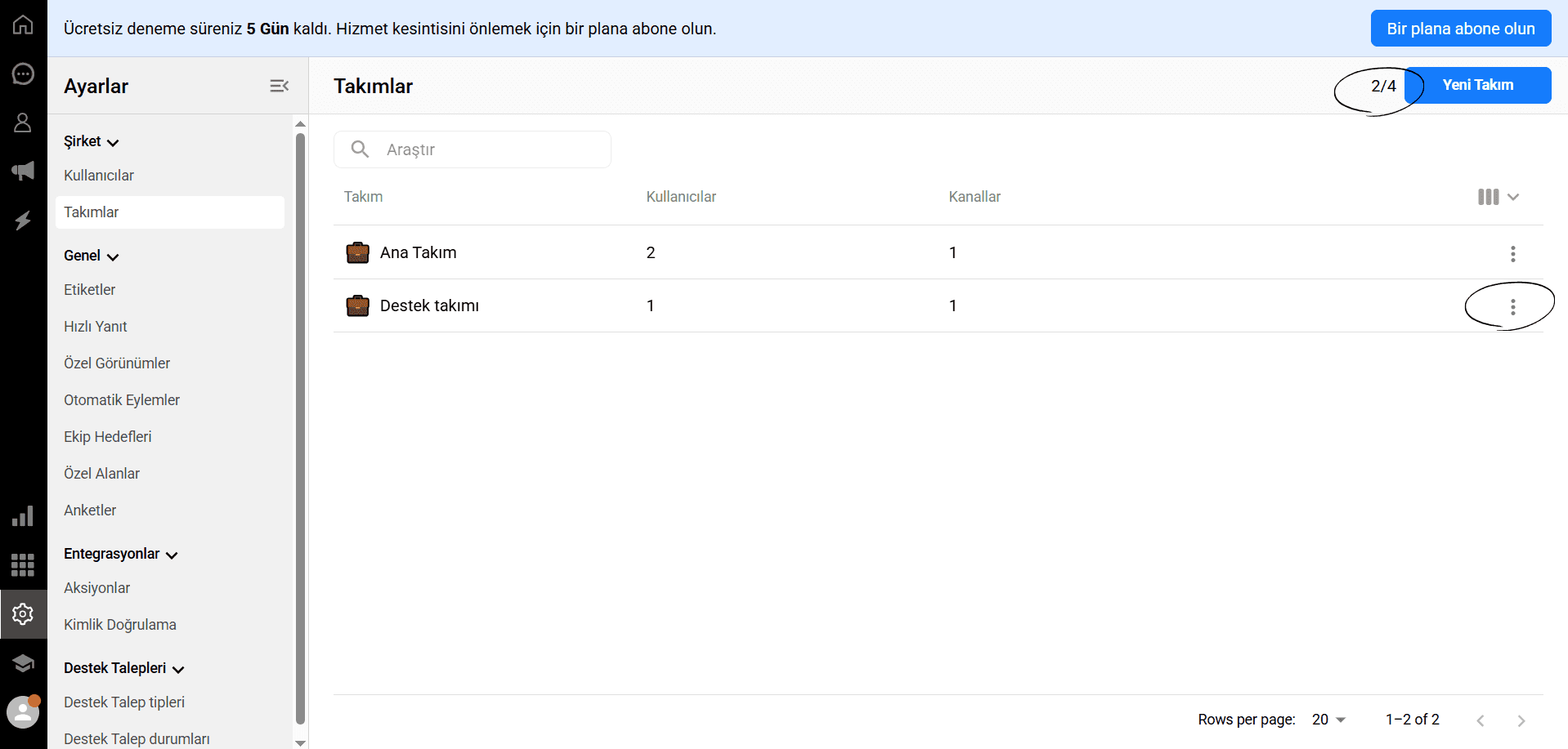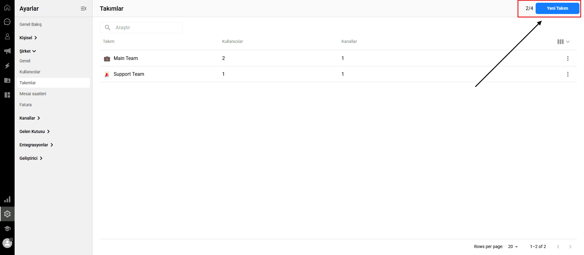 💡 İpucu: Yeni Takım butonunun yanında, sağ üst köşede görünen kesirli ifade (Örn: "2/4") takım limitinizi belirtir. Mevcut planınızda "oluşturulan takım sayısı / izin verilen maksimum takım sayısı" bilgisini gösterir.