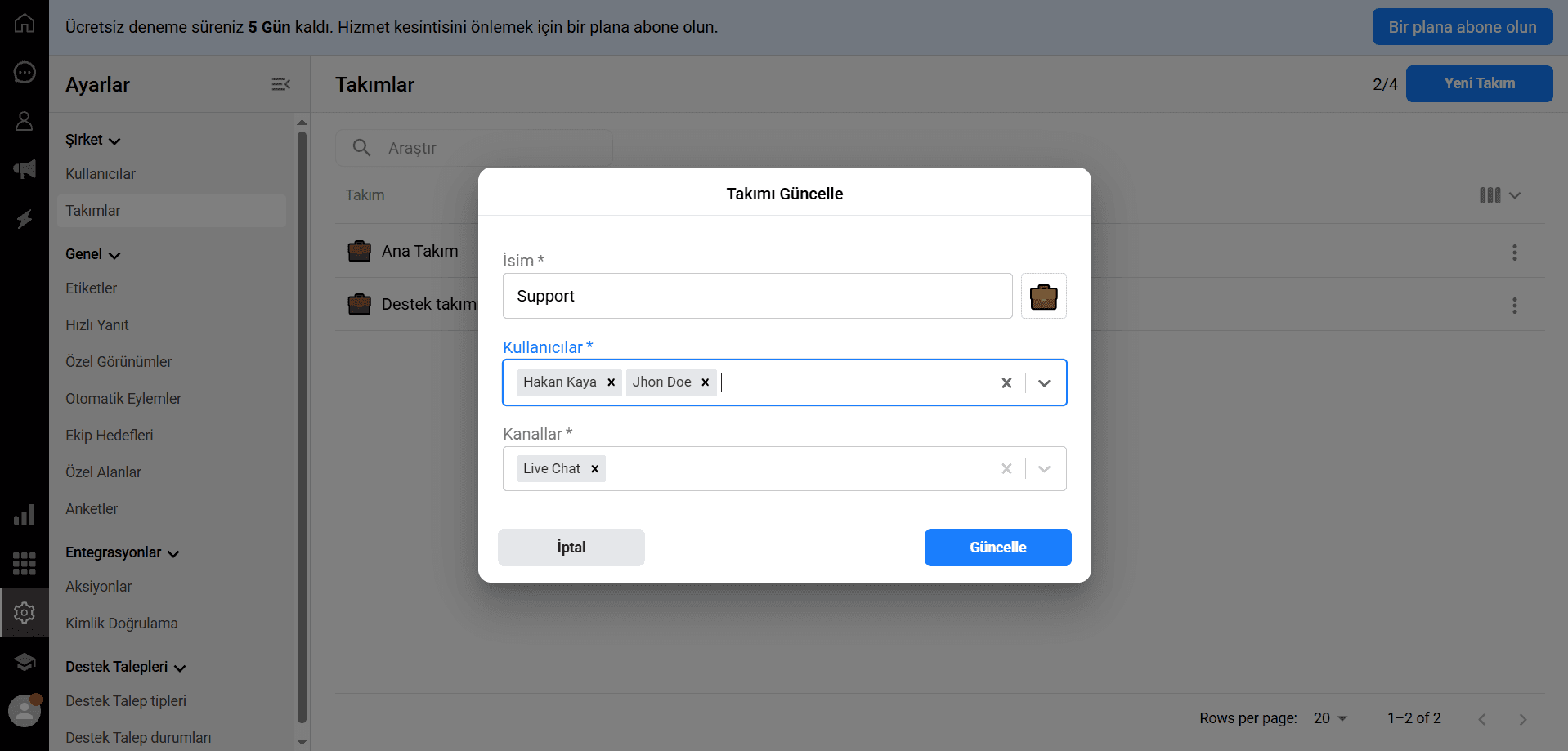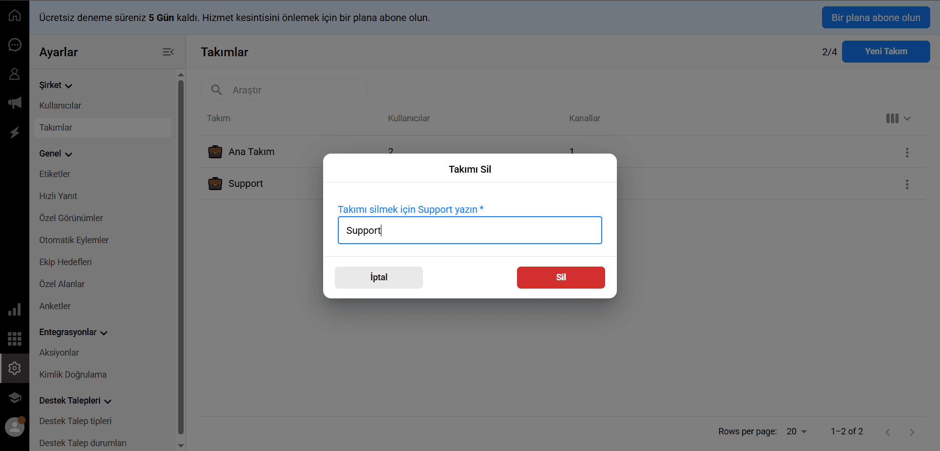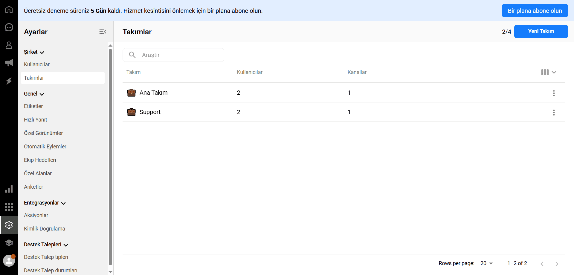 Müşteri destek veya satış süreçlerinizin farklı yönlerini yönetmek için birden fazla takım oluşturabilirsiniz.