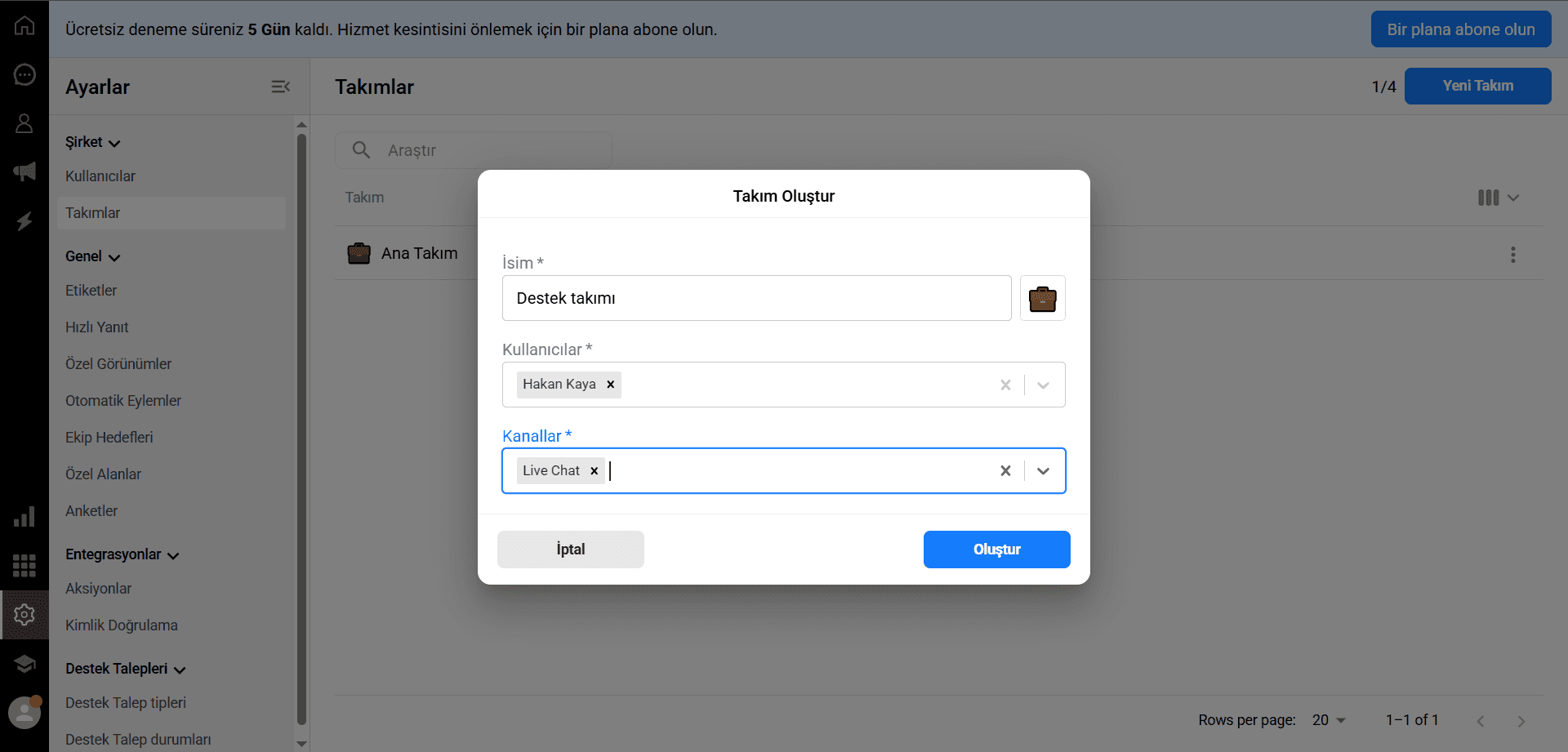 💡 İlk hesabınızı açtığınızda varsayılan olarak “Ana Takım” isimli bir takım otomatik olarak oluşturulur.