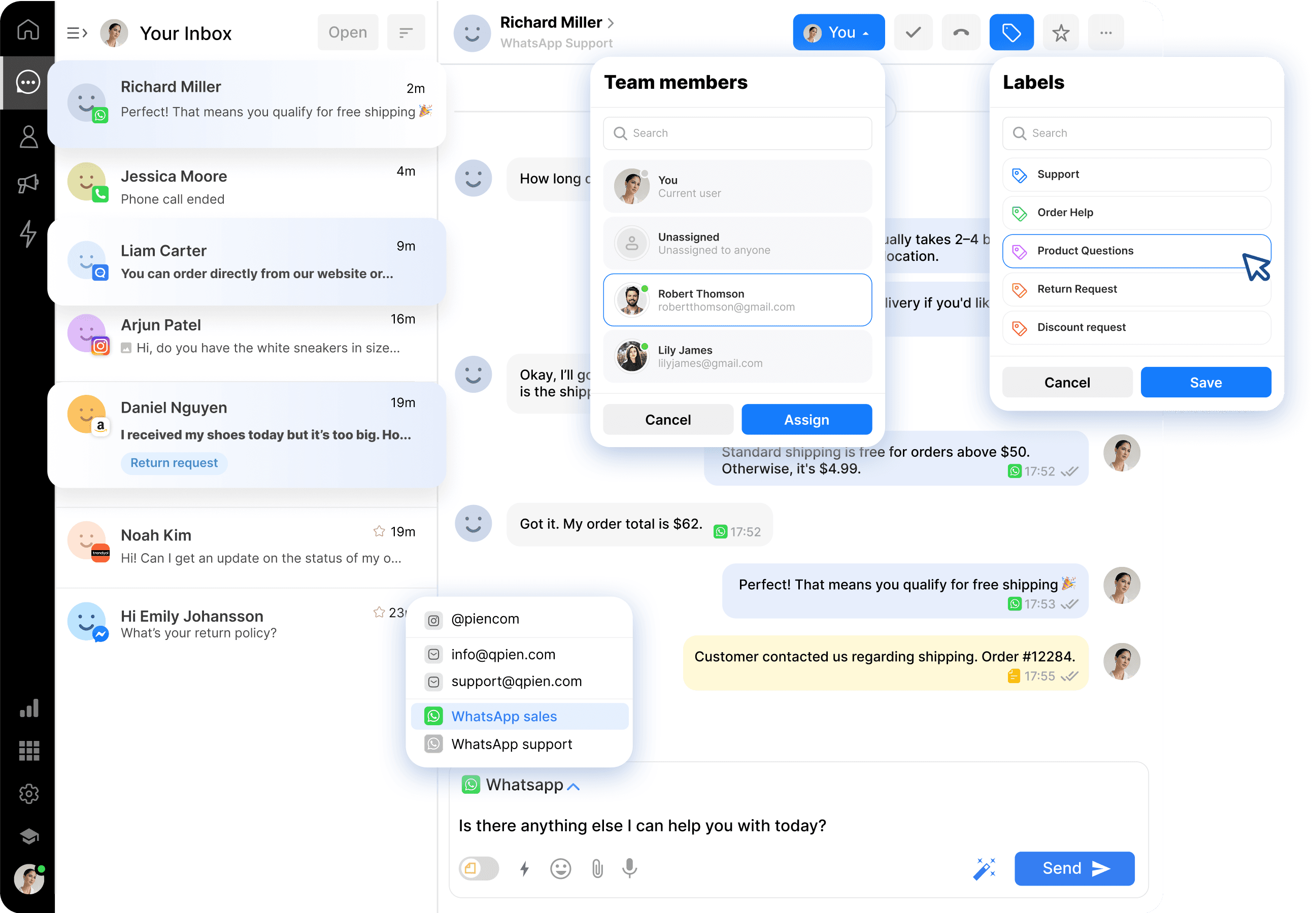 Connect all your support channels — like Live Chat, WhatsApp, and Instagram — and manage them through a single inbox.